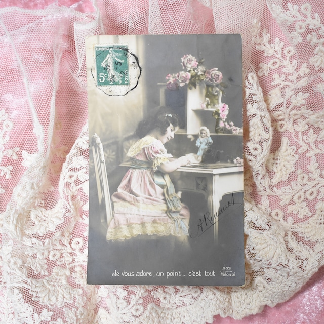 1900年代初頭~1910年代半ば頃フランスのアンティークポストカードです。 1800年代後半~1900年代初頭にかけてヨーロッパで大ブームとなったポストカード。 少女、美しい女性、子どもたち、自由な発想で描かれた多種多様なイラストレーションなどビジュアルを気軽に送り合える斬新さからポストカードは人々の間で日ごろの些細なメッセージからクリスマスやイースターなど四季のお祝いや誕生日のお祝い、近況報告など熱狂的に送り合われました。 当時の風俗をそのままに伝える1枚1枚が手焼きのリアルフォトの美しさや石版印刷によるイラストレーションの自由且つ豊かな発想力は未だに世界中のコレクターを魅了してやみません。 ◆ お気に入りのお人形さんをデスクに座らせて一緒にお手紙を書く愛らしい少女のアンティークポストカード。 素敵なデスクで認めるお手紙には大好きな人への愛で溢れていることでしょう。 カード下部には「あなたを愛しています、それだけです」という素敵な一文が添えられています。 少女の夢のように美しいドレスと薔薇が飾られた白いデスク。 やさしいパステルピンクとパステルブルーの手彩色が夢のような雰囲気を添えています。 当時の少女とお人形の日常が鮮やかに甦るようです。 ◆状態◆ フランス 1912年 パリ消印 リアルフォト マット 手彩色 使用済み サイズ:約14cm×9cm ◆購入の際の注意点◆ ・こちらのポストカードは100年以上経過した主に使用済みポストカードとなります。 アンティークにご理解がある方のみご購入ください。 ・100年以上経過している品となりますので、スレ・キズ・破れ・シミ・汚れなどはもちろんございます。 ・実物の色味に近いように撮影しておりますが、PC・スマホ・タブレット等各種閲覧環境やモニターの色味によって若干見え方が変わる場合がございます。 ・他所でも販売しておりますので既に売約済み・販売済みの場合はご容赦ください。 ・当店のサイトから画像・文章を転載し販売している詐欺サイトがございます。 商品の取り扱いは当オンラインショップ<Antiques amour violet>のみとなっておりますのでご注意ください。
