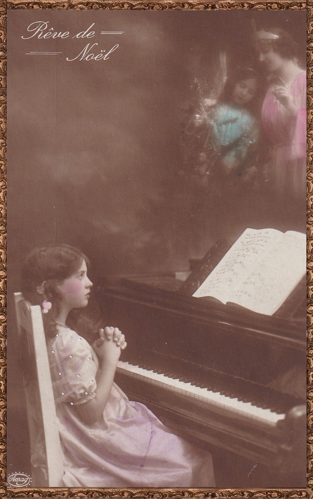 *Antique postcard クリスマスにピアノを演奏する美しい少女とママ2 1911年 Germany P266