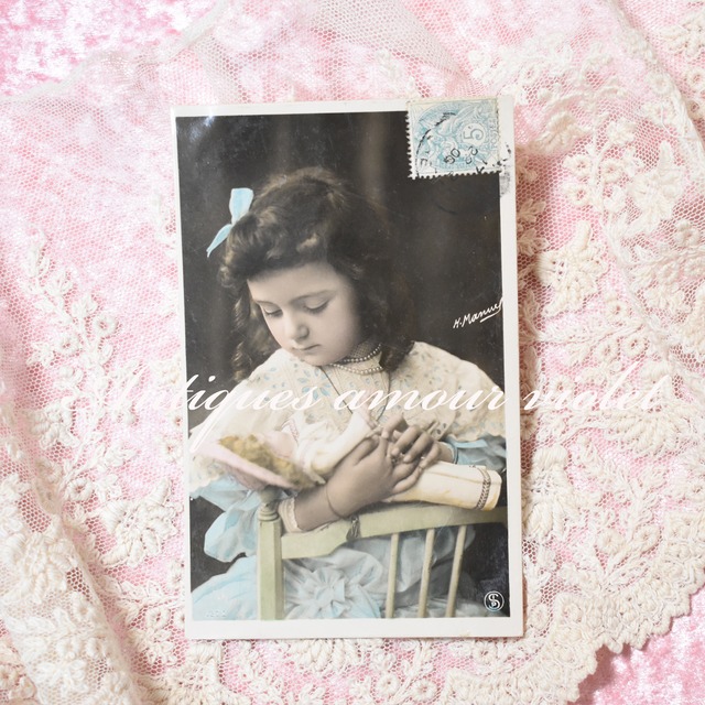 1900年代初頭頃~1910年代半ば頃ドイツのアンティークポストカードです。 1800年代後半~1900年代初頭にかけてヨーロッパで大ブームとなったポストカード。 少女、美しい女性、子どもたち、自由な発想で描かれた多種多様なイラストレーションなどビジュアルを気軽に送り合える斬新さからポストカードは人々の間で日ごろの些細なメッセージからクリスマスやイースターなど四季のお祝いや誕生日のお祝い、近況報告など熱狂的に送り合われました。 当時の風俗をそのままに伝える1枚1枚が手焼きのリアルフォトの美しさや石版印刷によるイラストレーションの自由且つ豊かな発想力は未だに世界中のコレクターを魅了してやみません。 ◆ お人形を寝かしつける愛らしい少女のアンティークポストカード。 素敵なレース襟のワンピースとパールのネックレス、 少女がお人形に向ける端正でやさしい眼差しが印象的な一枚。 少女たちの愛らしい瞬間を捉えることがとりわけ秀逸であったカメラマン・H.Manuelの作品です。 ◆状態◆ ドイツ製 1906年消印 リアルフォト グロス加工 手彩色 使用済み サイズ:約14cm×9cm ◆購入の際の注意点◆ ・こちらのポストカードは100年以上経過した主に使用済みポストカードとなります。 アンティークにご理解がある方のみご購入ください。 ・100年以上経過している品となりますので、スレ・キズ・破れ・シミ・汚れなどはもちろんございます。 ・実物の色味に近いように撮影しておりますが、PC・スマホ・タブレット等各種閲覧環境やモニターの色味によって若干見え方が変わる場合がございます。 ・他所でも販売しておりますので既に売約済み・販売済みの場合はご容赦ください。 ・当店のサイトから画像・文章を転載し販売している詐欺サイトがございます。 商品の取り扱いは当オンラインショップ<Antiques amour violet>のみとなっておりますのでご注意ください。 ・商品画像中のショップ名表記は無断転載防止用となります。 実物の商品には記入はございません。 当サイトにおける全ての画像の無断転載・加工・使用・商用利用を固く禁じます。