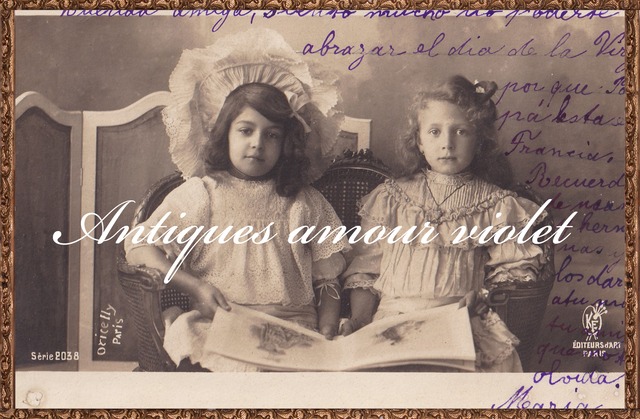 1900年代初頭頃フランスのアンティークポストカードです。 1800年代後半~1900年代初頭にかけてヨーロッパで大ブームとなったポストカード。 少女、美しい女性、子どもたち、自由な発想で描かれた多種多様なイラストレーションなどビジュアルを気軽に送り合える斬新さからポストカードは人々の間で日ごろの些細なメッセージからクリスマスやイースターなど四季のお祝いや誕生日のお祝い、近況報告など熱狂的に送り合われました。 当時の風俗をそのままに伝える1枚1枚が手焼きのリアルフォトの美しさや石版印刷によるイラストレーションの自由且つ豊かな発想力は未だに世界中のコレクターを魅了してやみません。 ◆ まるでお人形のような華やかなワンピースとボンネットでおめかしした可愛らしい少女たちのアンティークポストカード。 仲良く絵本を読む少女たちの素晴らしいお洋服のデザイン、レースの美しさ、 身に着けたハートのペンダントとブローチと見所満載です。 1900年代初頭フランスにおける少女服の愛くるしさを凝縮したような見事な一枚です。 後にも先にも少女服がこれほどまでに愛らしい時代はないでしょう。 真っ直ぐにカメラのレンズを見つめる瞳と少女たちの眼差しの在りかを失った膝の上の大きな絵本。 当時の少女・子どもの服飾を知る上でも素晴らしい一枚です。 このような日常が流れていたことに改めて心惹かれます。 ◆状態◆ 1900年代初頭頃 フランス・パリ撮影 リアルフォト マット モノクローム 使用済み サイズ:約14cm×9cm ◆購入の際の注意点◆ ・こちらのポストカードは100年以上経過した主に使用済みポストカードとなります。 アンティークにご理解がある方のみご購入ください。 ・100年以上経過している品となりますので、スレ・キズ・破れ・シミ・汚れなどはもちろんございます。 ・実物の色味に近いように撮影しておりますが、PC・スマホ・タブレット等各種閲覧環境やモニターの色味によって若干見え方が変わる場合がございます。 ・他所でも販売しておりますので既に売約済み・販売済みの場合はご容赦ください。 ・当店のサイトから画像・文章を転載し販売している詐欺サイトがございます。 商品の取り扱いは当オンラインショップ<Antiques amour violet>のみとなっておりますのでご注意ください。 ・商品画像中のショップ名表記は無断転載防止用となります。 実物の商品には記入はございません。 当サイトにおける全ての画像の無断転載・加工・使用・商用利用を固く禁じます。