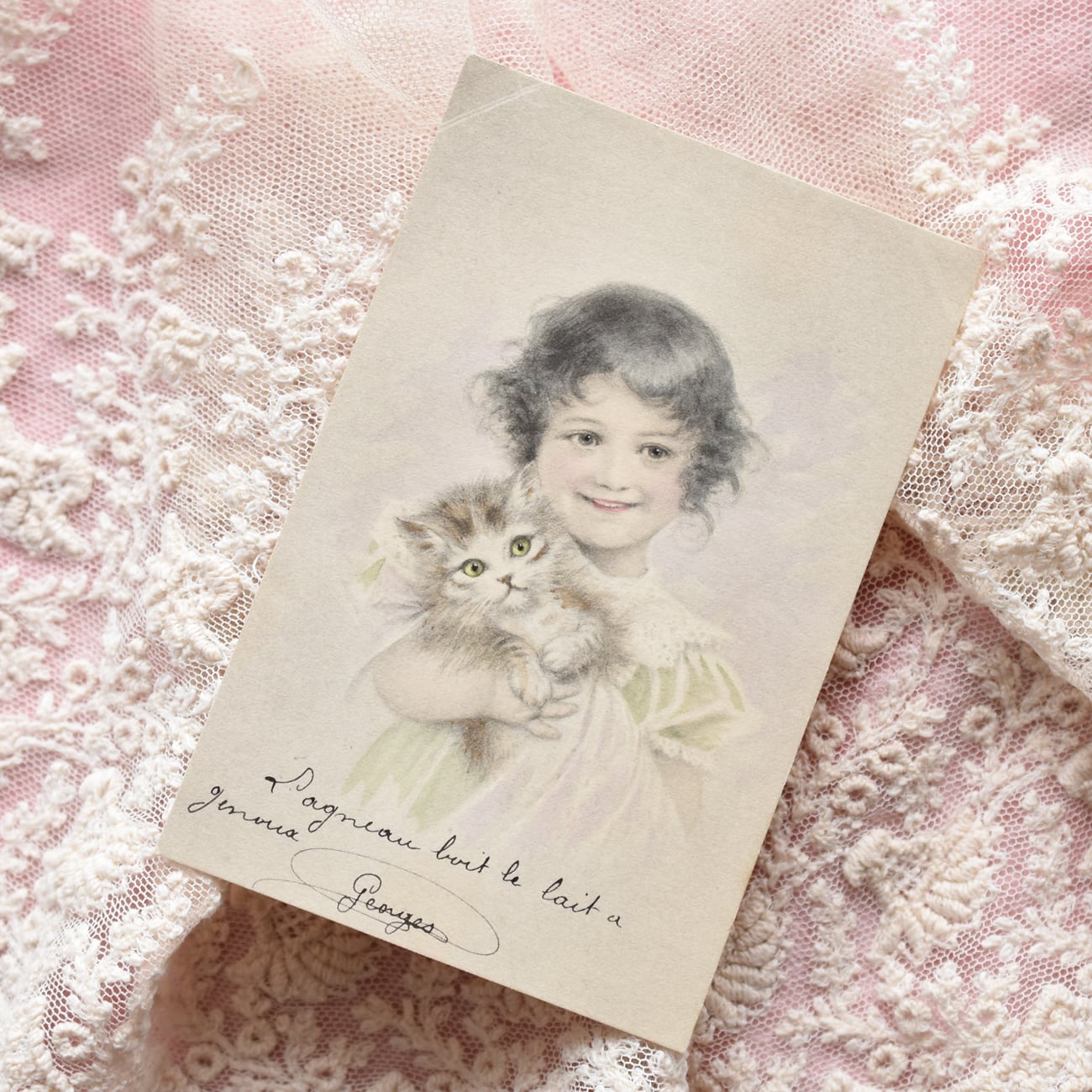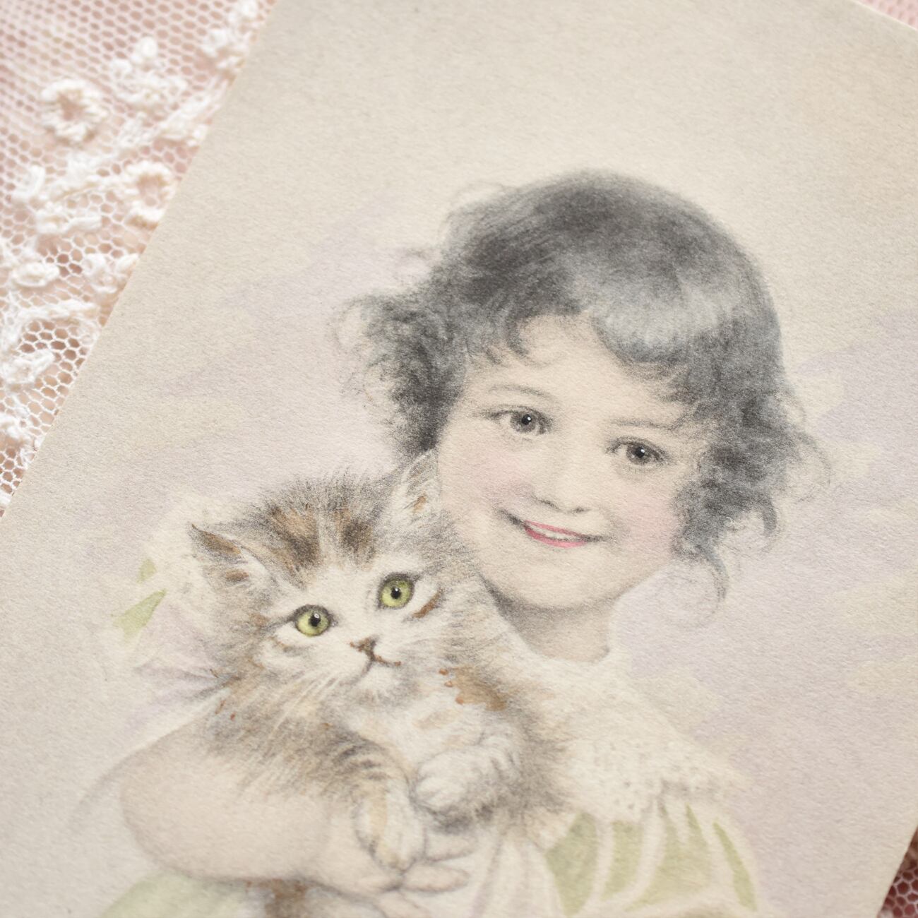 仔猫の瞳と少女のドレスに添えられたやさしいグリーンの手彩色が絵全体に素晴らしい共鳴を見せています。