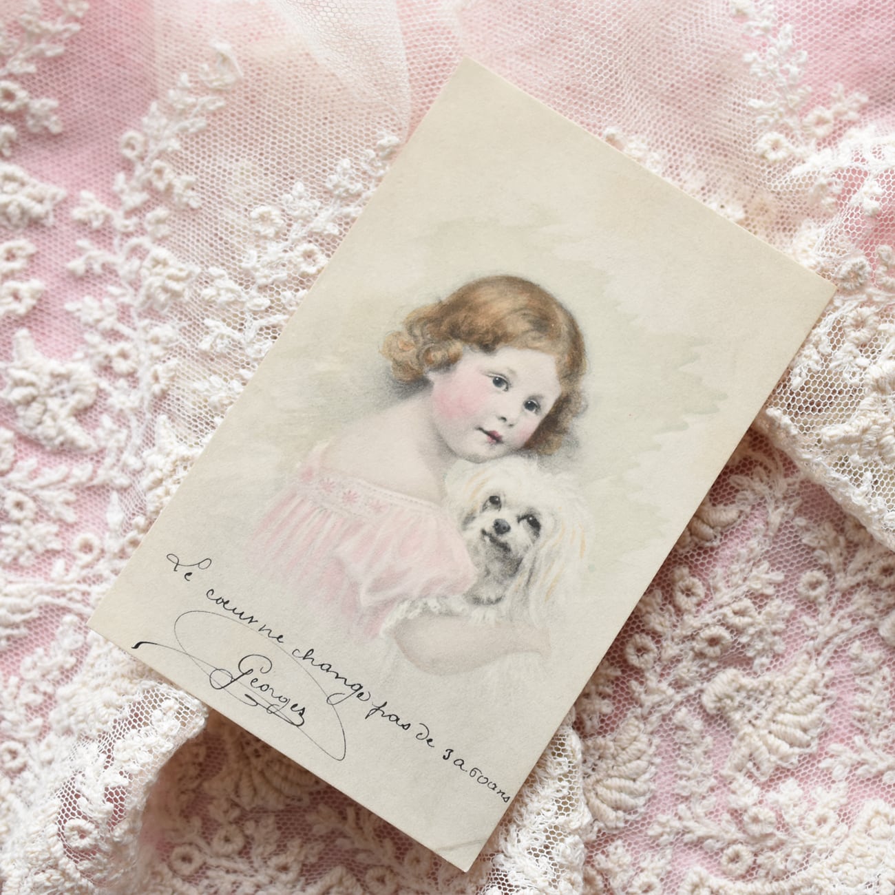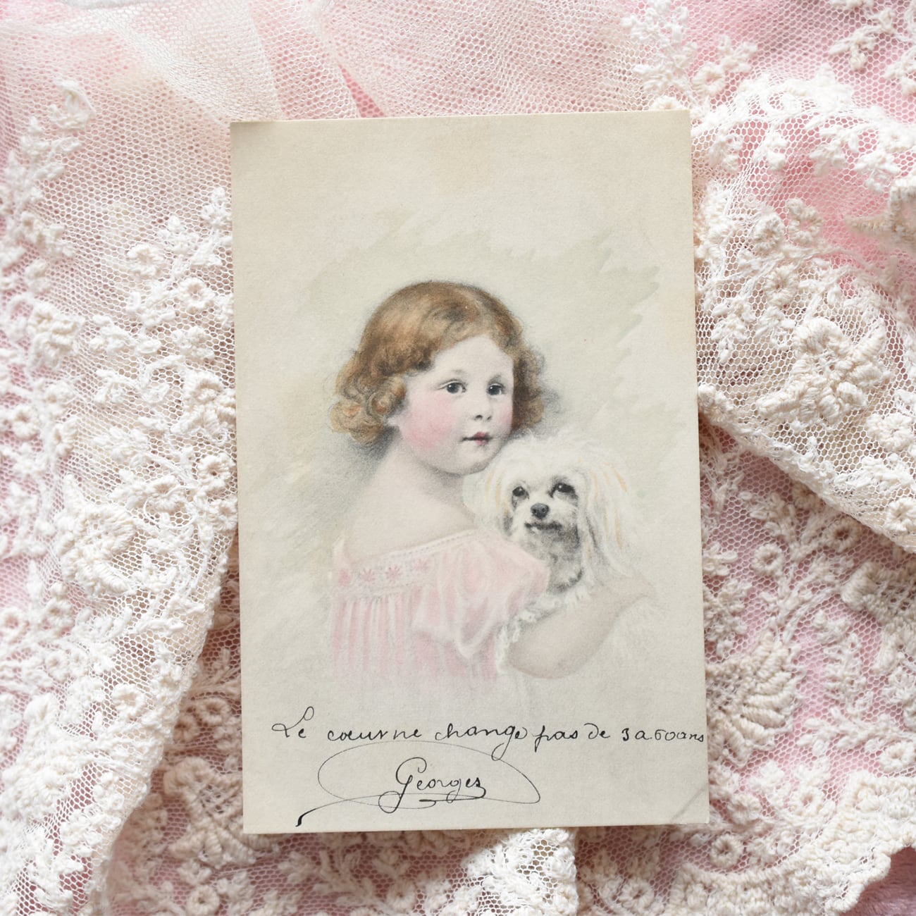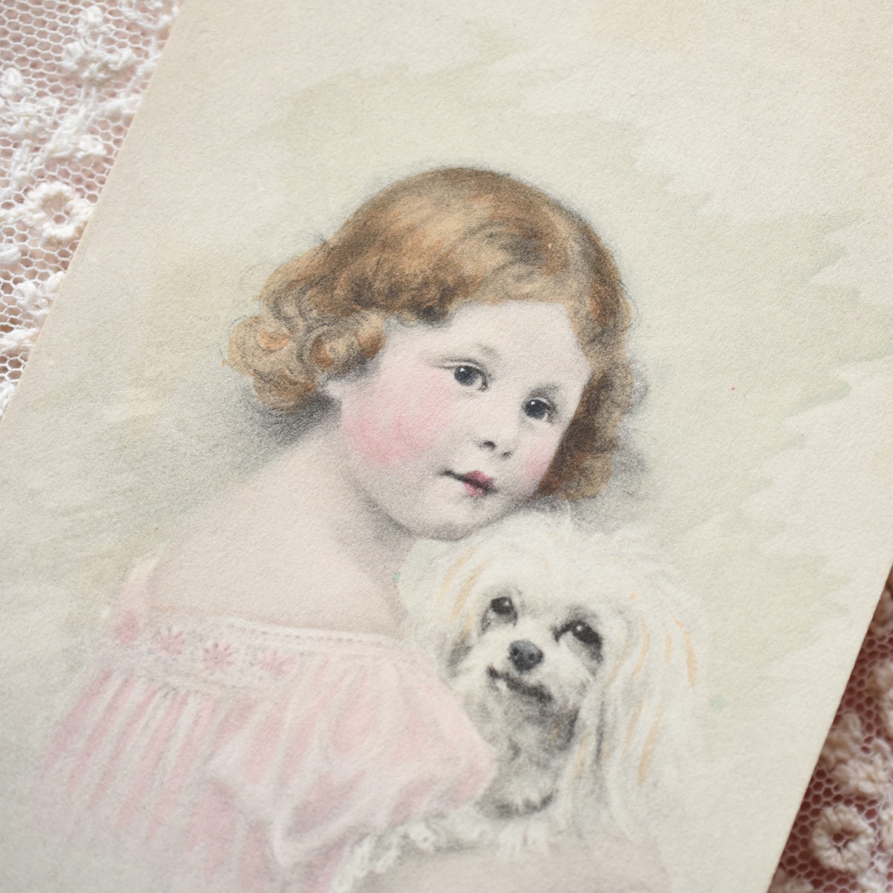犬を抱く愛らしい少女のVIENNEアンティークポストカード。