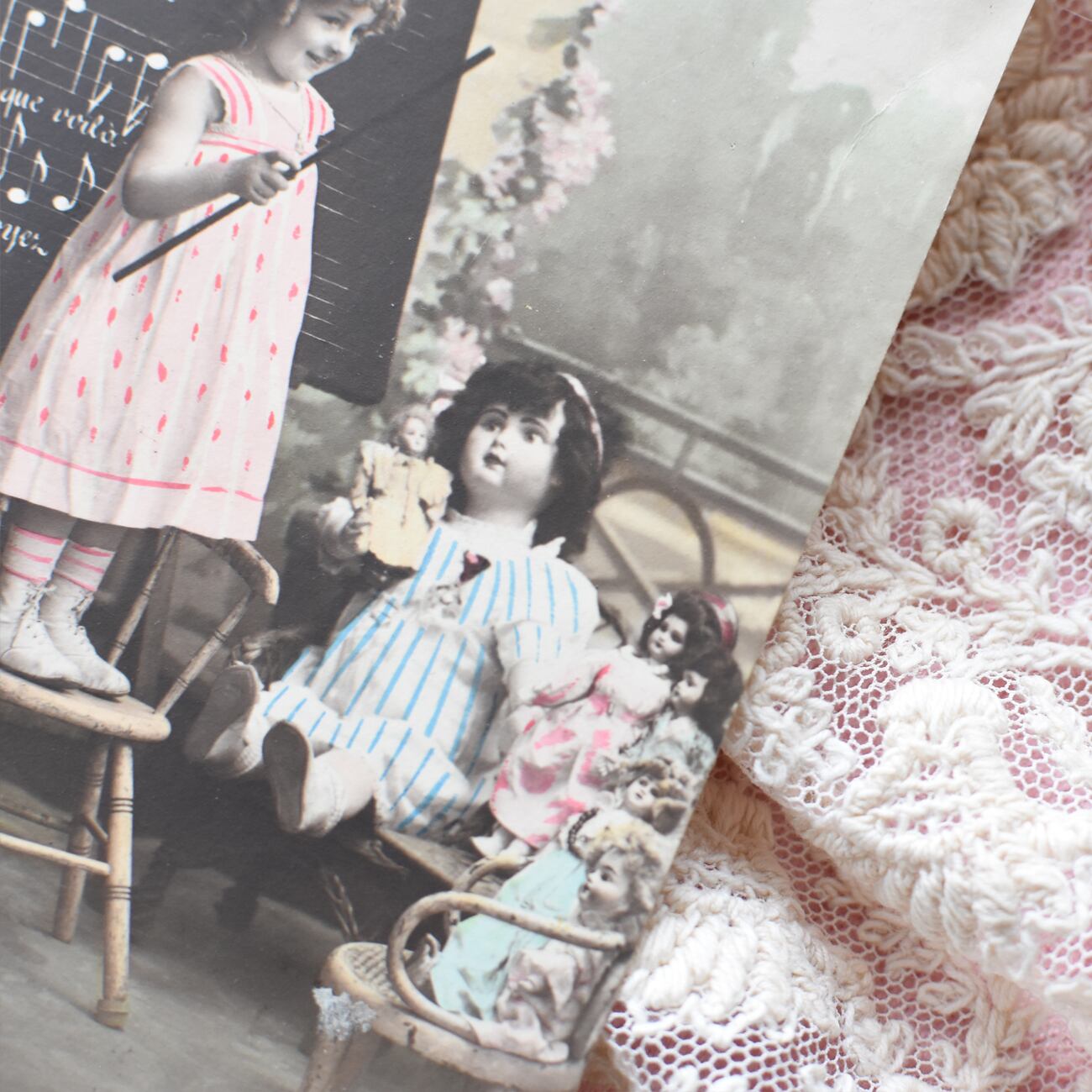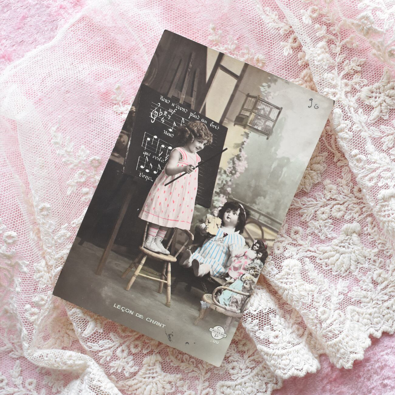 お人形たちにお歌のレッスンをする可愛らしい少女のアンティークポストカード。