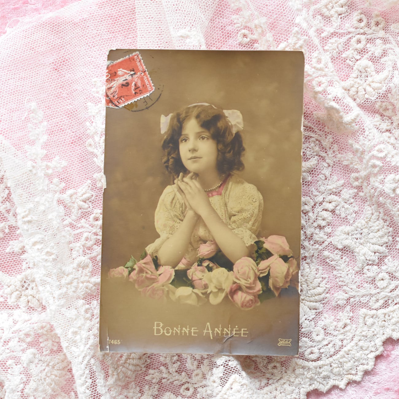 *Antique postcard 薔薇と乙女 1912年 France P126