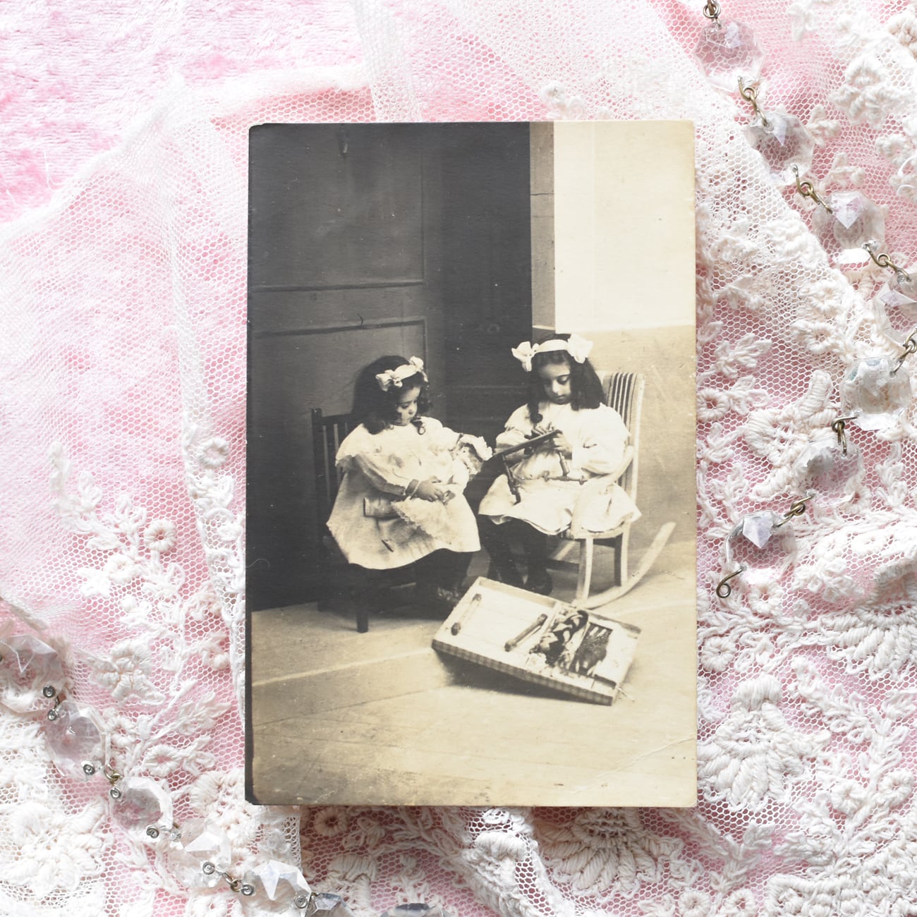 お人形とおままごとに熱中する可愛らしい少女たちのアンティークポストカード。