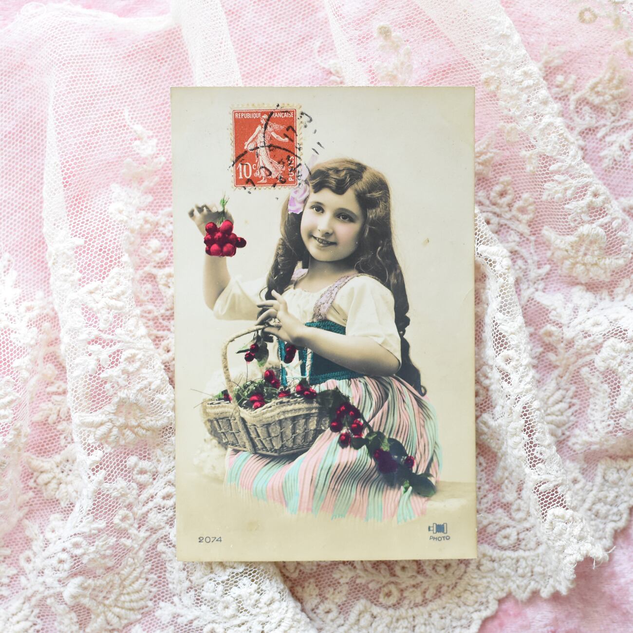 さくらんぼ狩りを楽しむ愛らしい少女のアンティークポストカード。