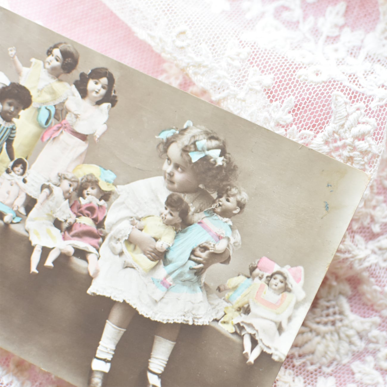 総勢14体の1900年代初頭頃のビスクドールに囲まれた少女の何とも可愛らしいアンティークポストカード。