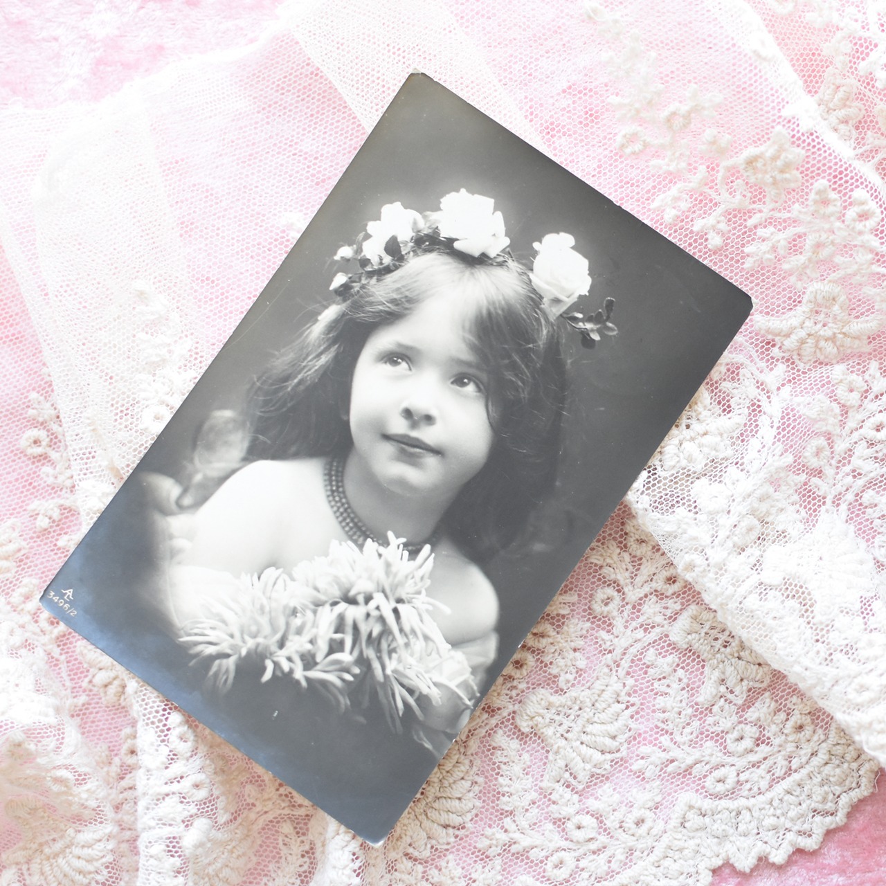 白薔薇の花冠と珊瑚のネックレスが印象的な儚げで愛らしい黒髪の少女のアンティークポストカード。