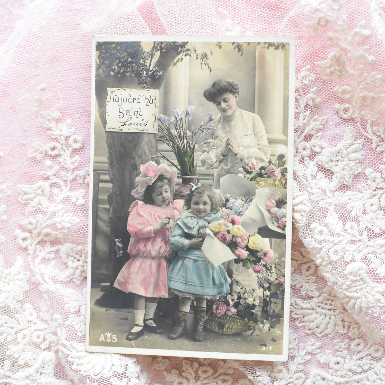 *Antique postcard フラワーショップでお買い物の可愛い少女たち 1906年 France P190