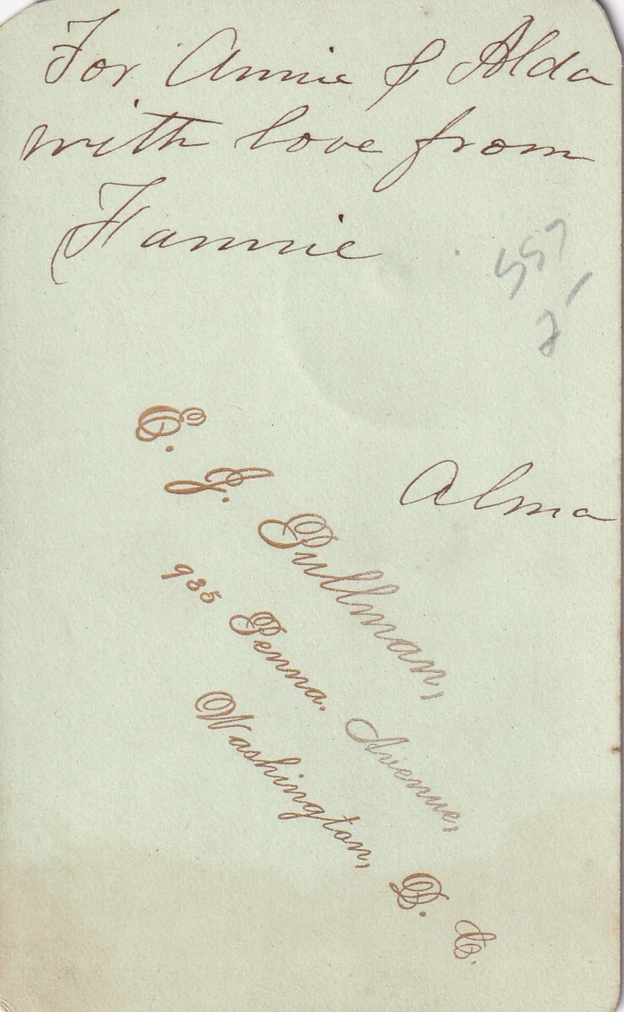 台紙裏面には「アニーとアルダへ愛をこめて」と走り書きで記されています。