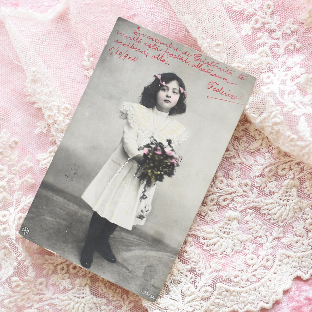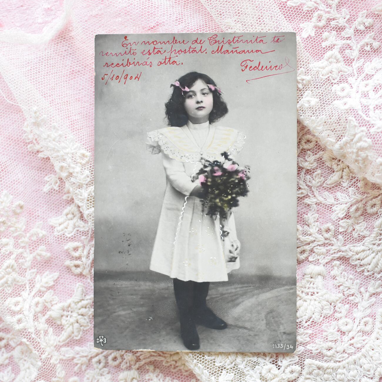 ヘアの両サイドに留められた小さなリボンがチャームポイントの美しい少女のアンティークポストカード。