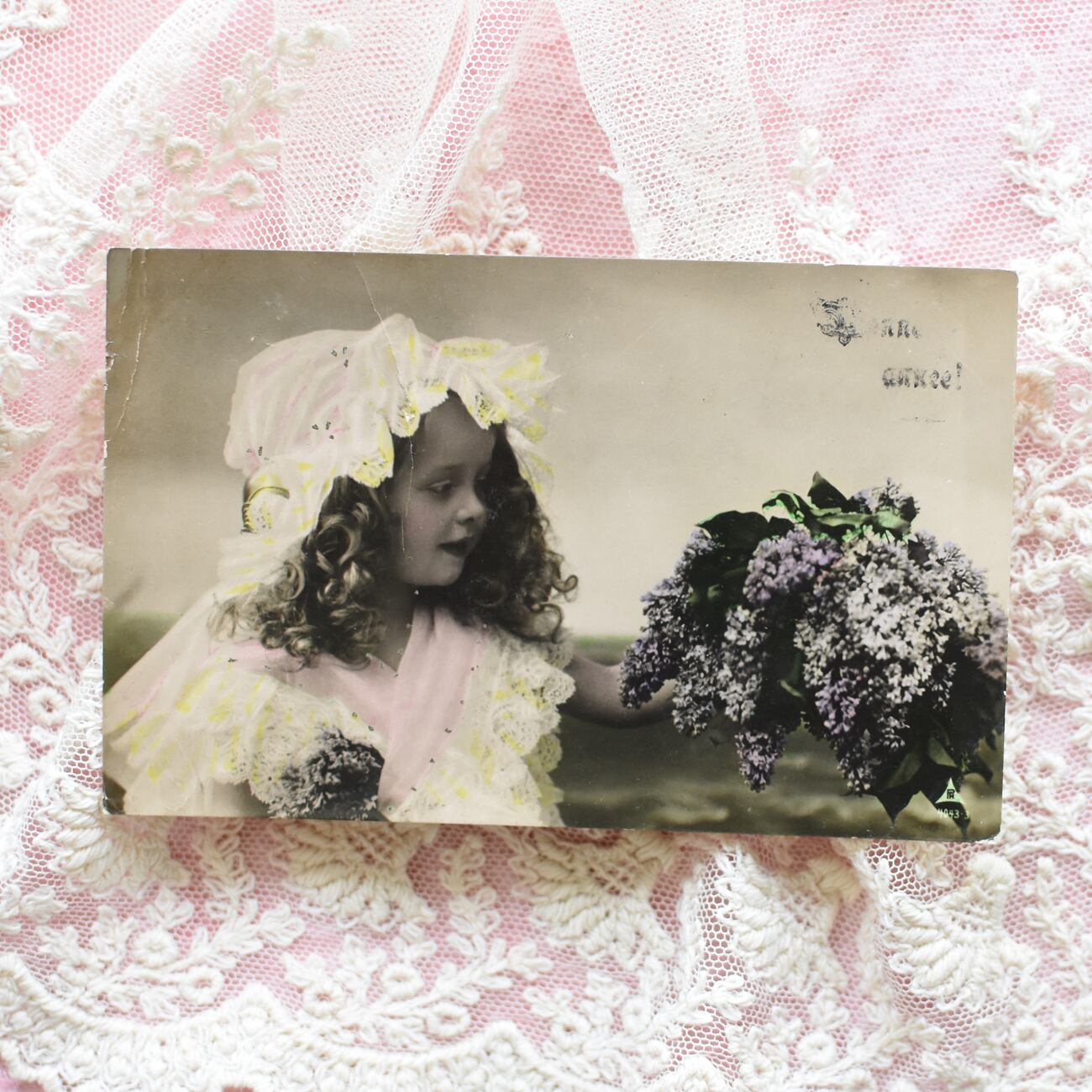 お人形のようなカーリーヘアが愛らしい少女のアンティークポストカード。