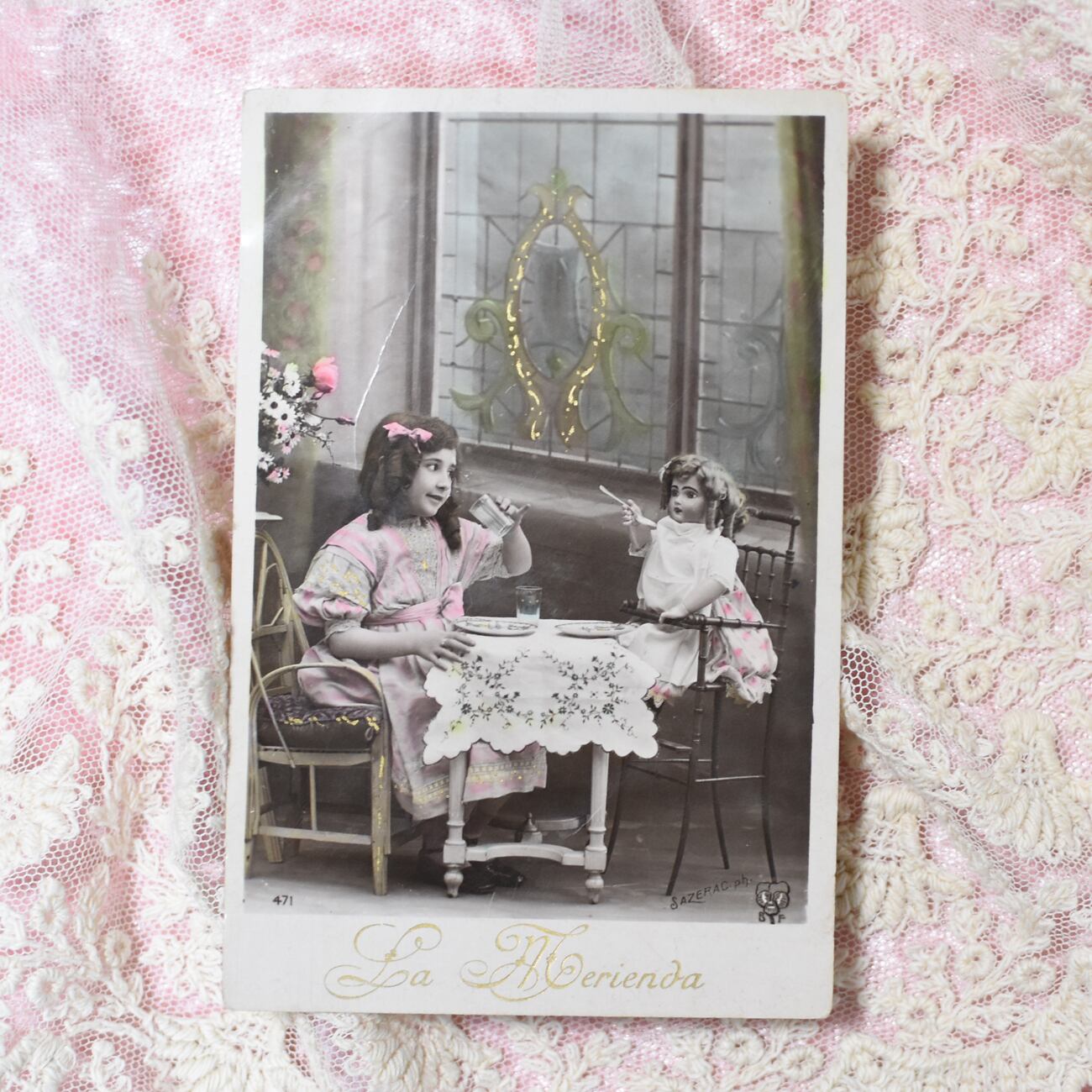 *Antique postcard お人形とおままごとをする可愛い少女 P198