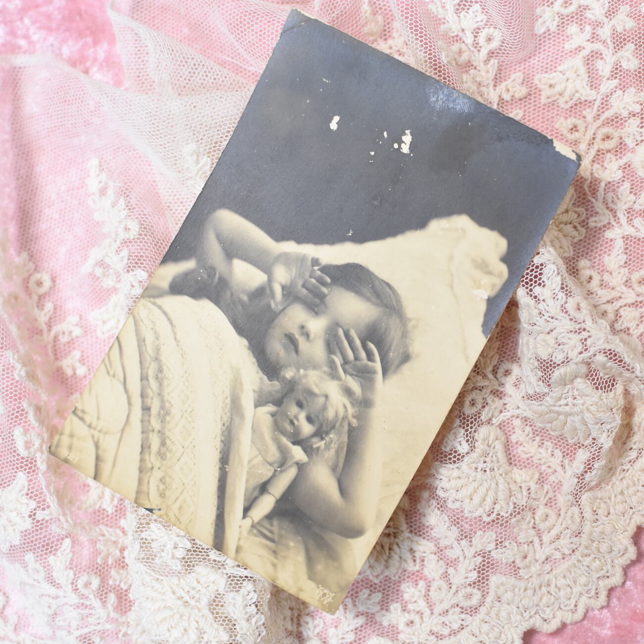 お人形と一緒にすやすやと眠る愛らしい少女のアンティークポストカード。