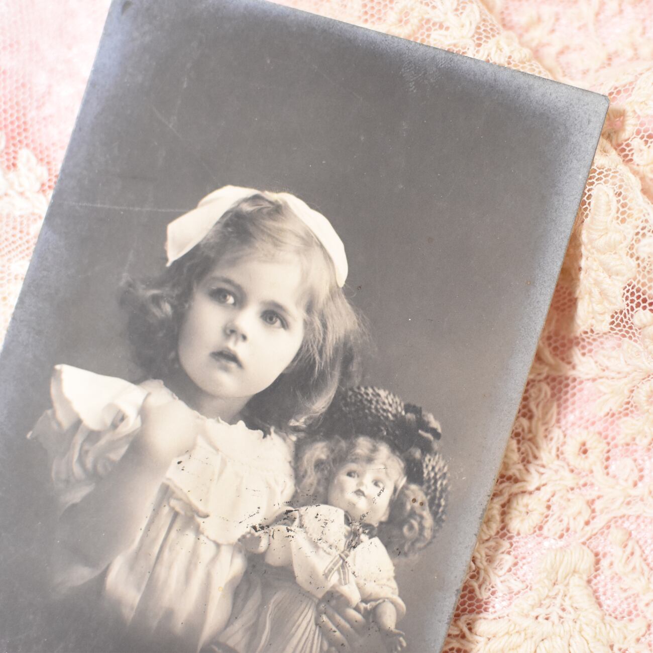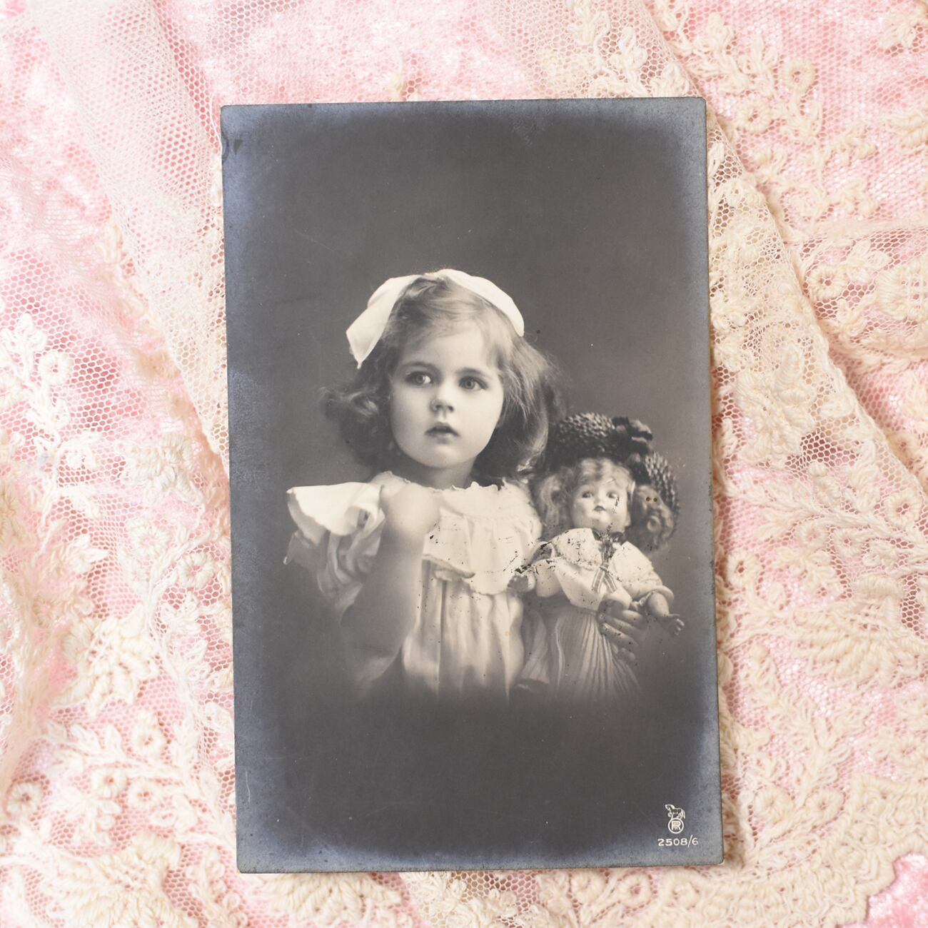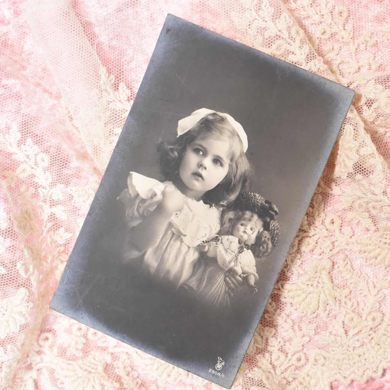 あどけない少女と可愛らしいお人形の表情が引き立つモノクロームの美しいカードです。