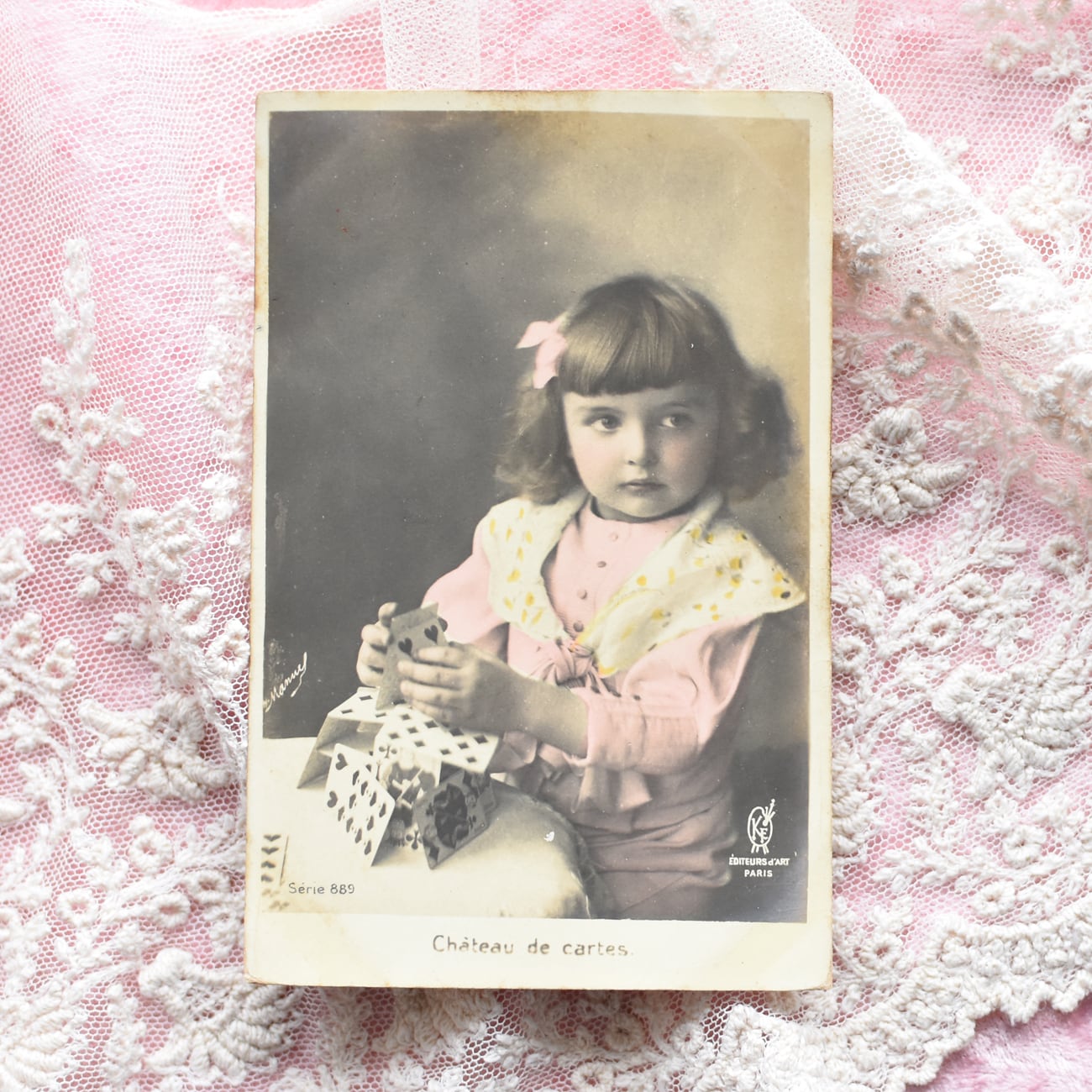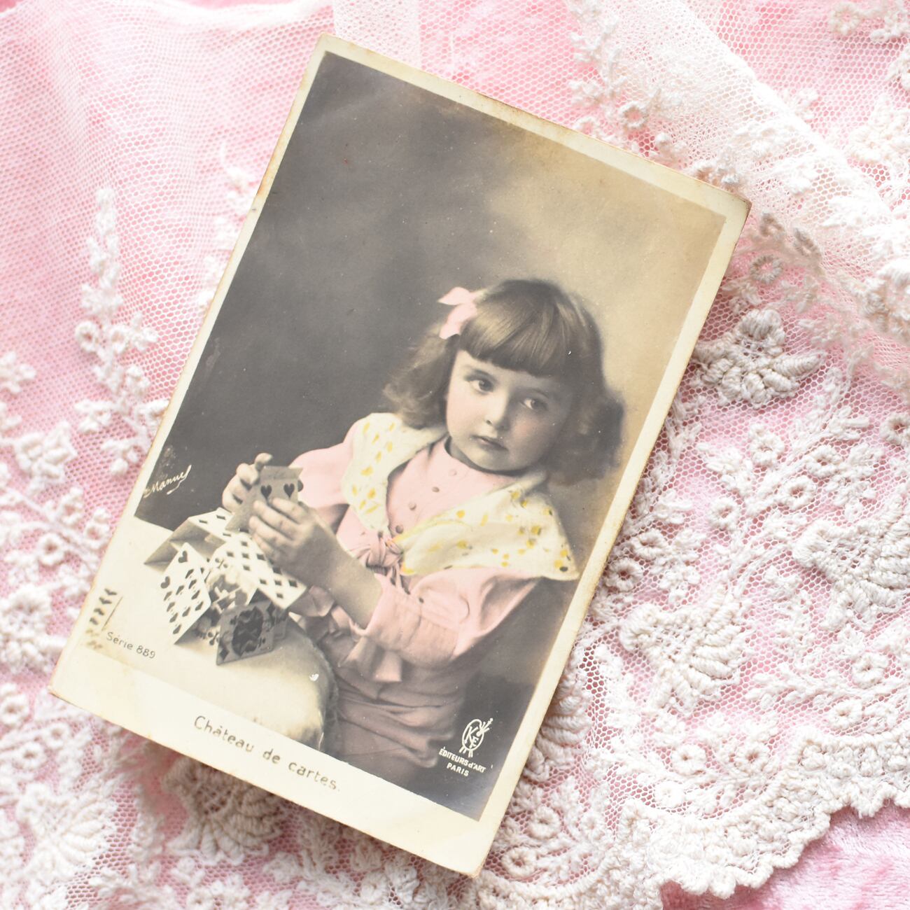 トランプのお城を作る可愛い少女のアンティークポストカード。