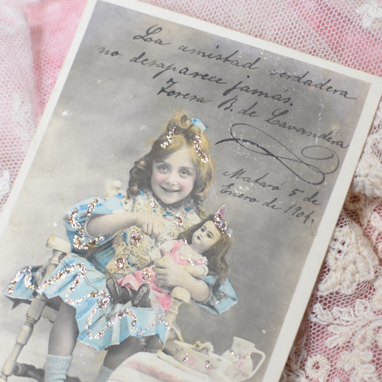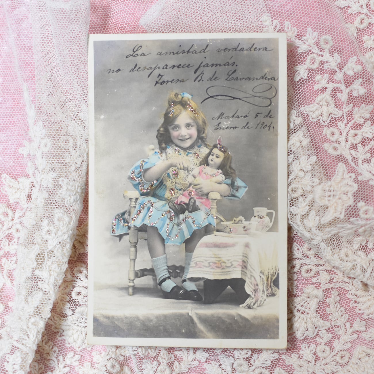 大好きなお人形とおままごとを楽しむ可愛らしい少女のアンティークポストカード。