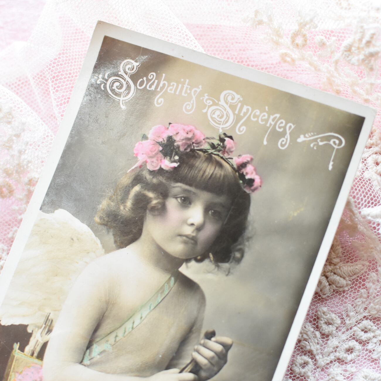 可愛らしい恋のキューピットに扮した少女のアンティークポストカード。