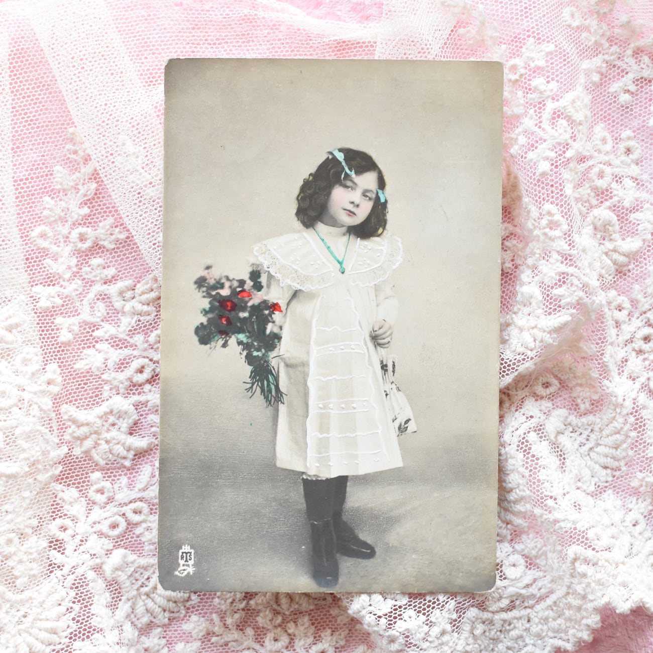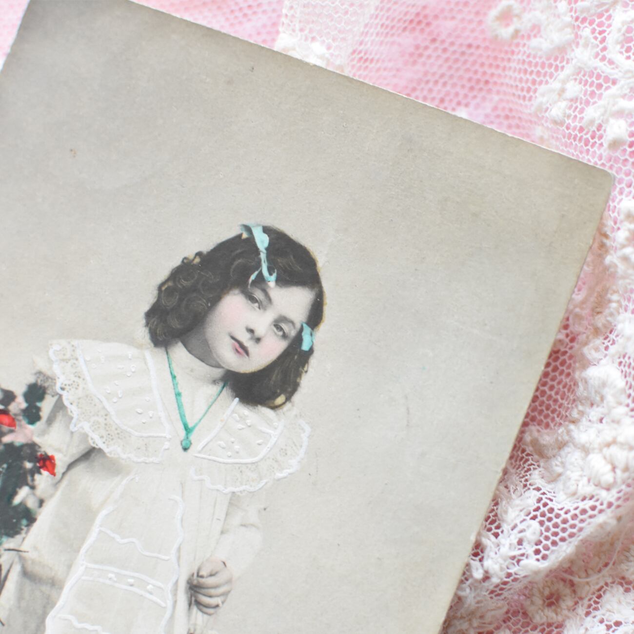ヘアの両サイドに留められた小さなリボンがチャームポイントの美しい少女のアンティークポストカード。
