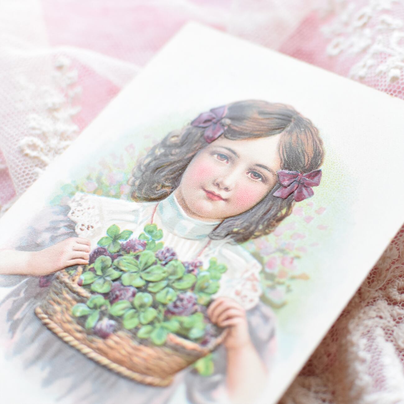 少女の写真を元に描き起こされたとても愛らしいクロモリトグラフとエンボス加工の見事なイラストレーションのポストカードです。
