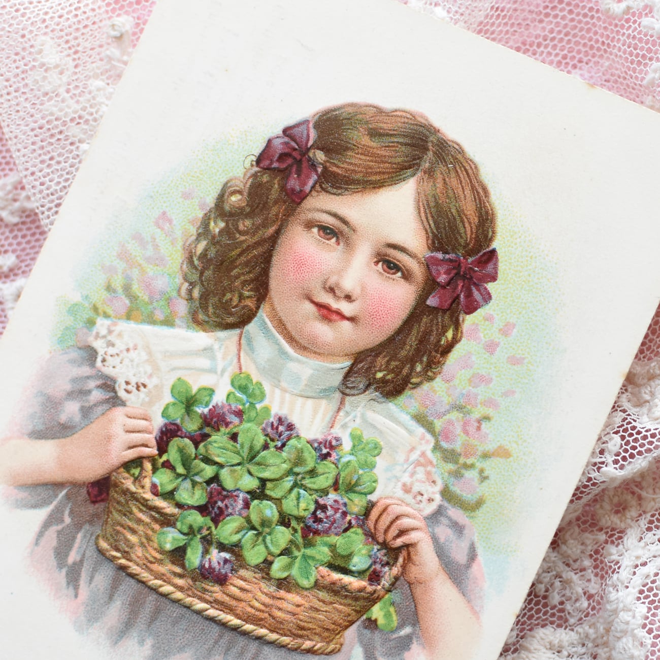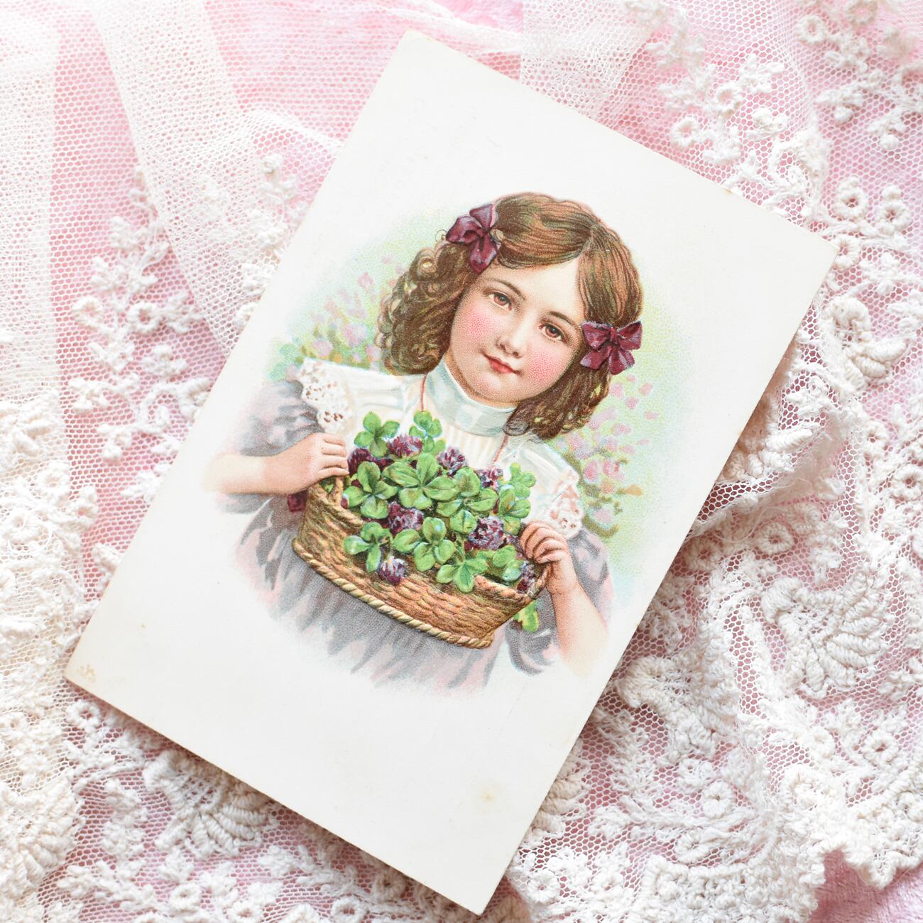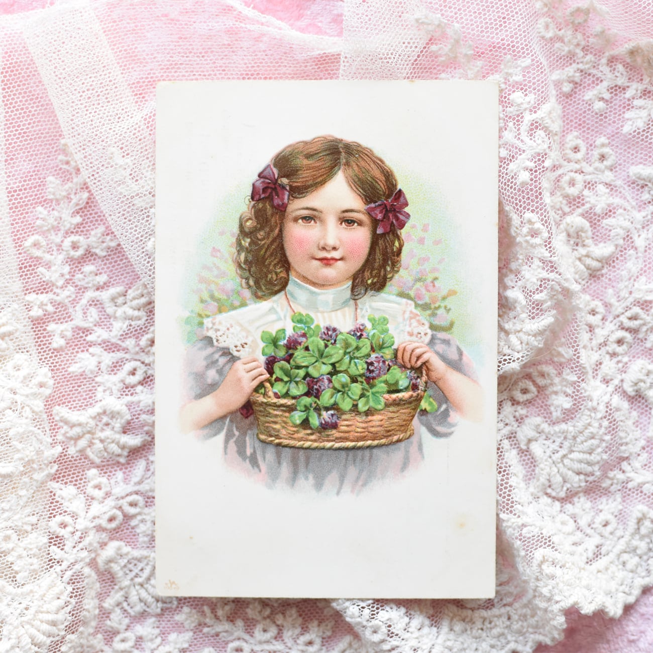少女をクローズアップで真っ直ぐに捉えた構図が有名なフォトポストカードを元にしたイラストレーションのクロモリトグラフアンティークポストカード。