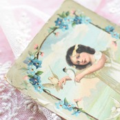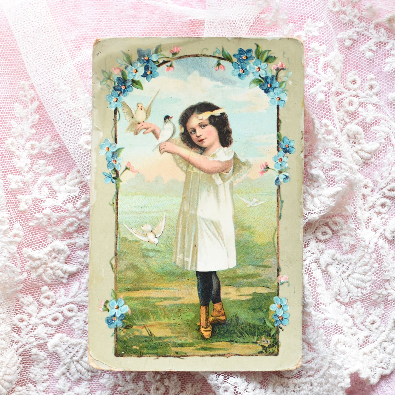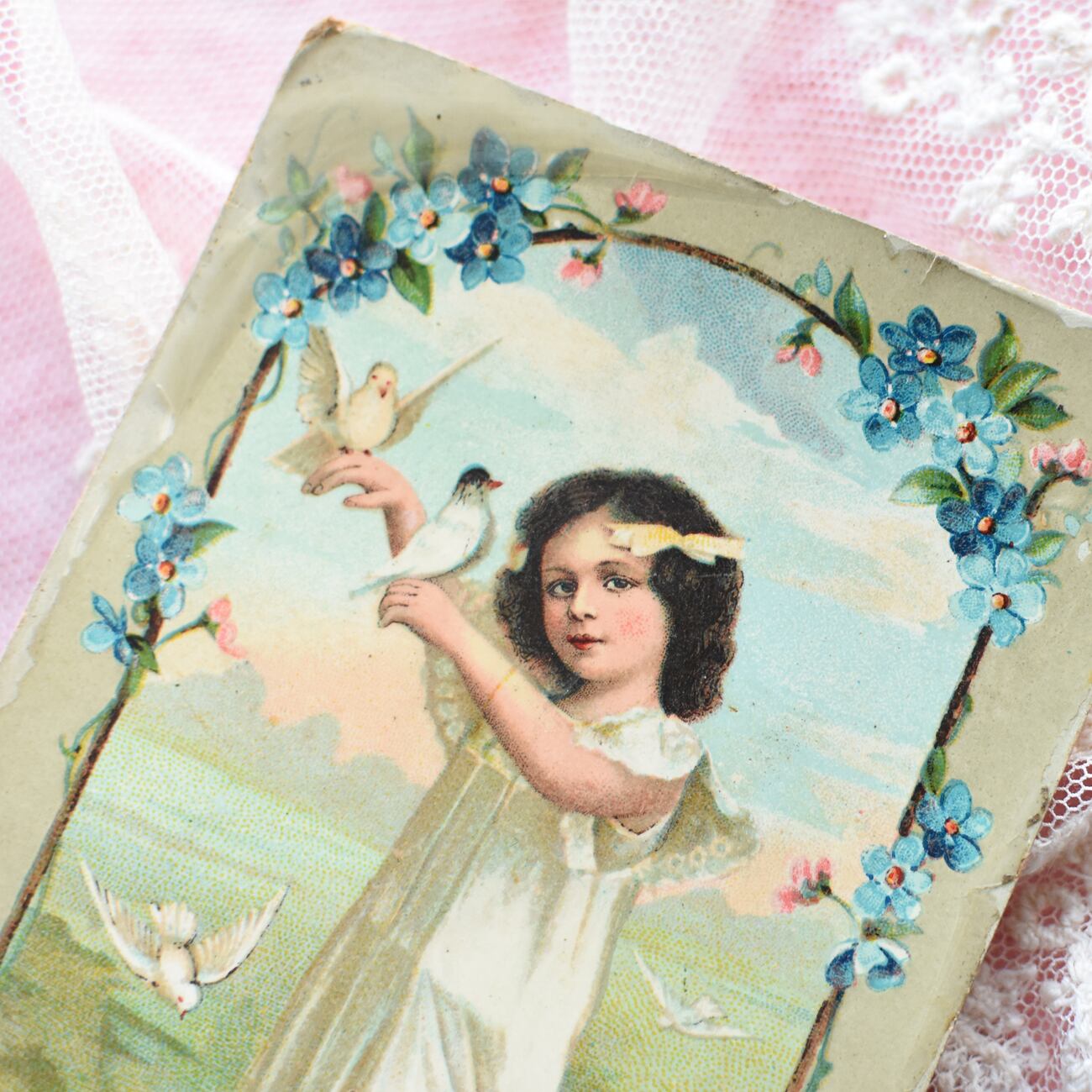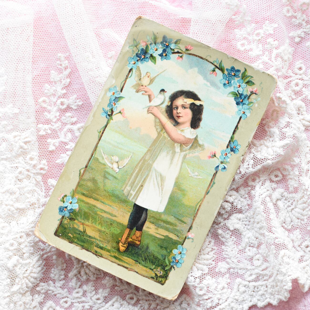 白鳩と戯れる愛らしい少女のアンティークポストカード。