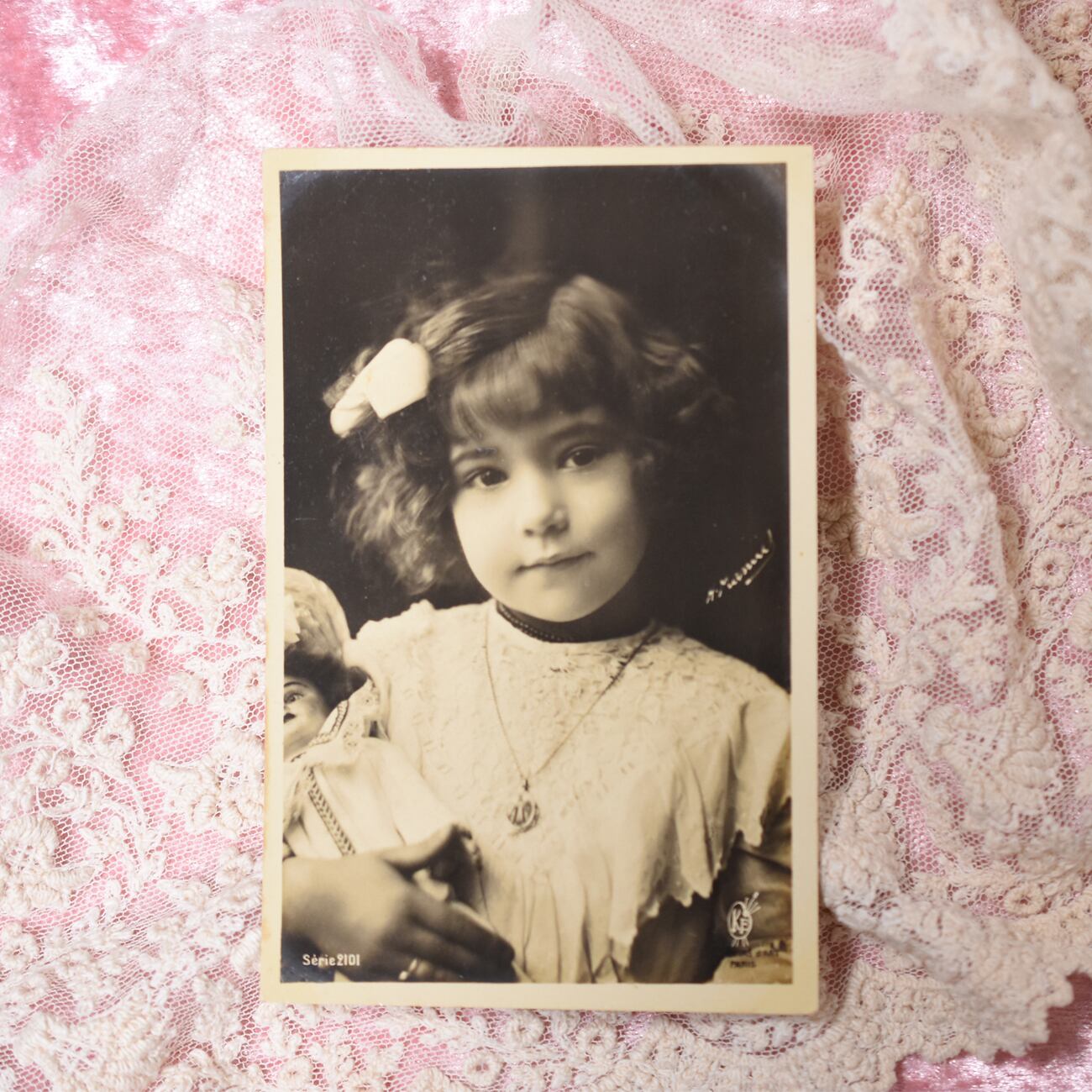 お人形を抱く愛らしい少女のアンティークポストカード。