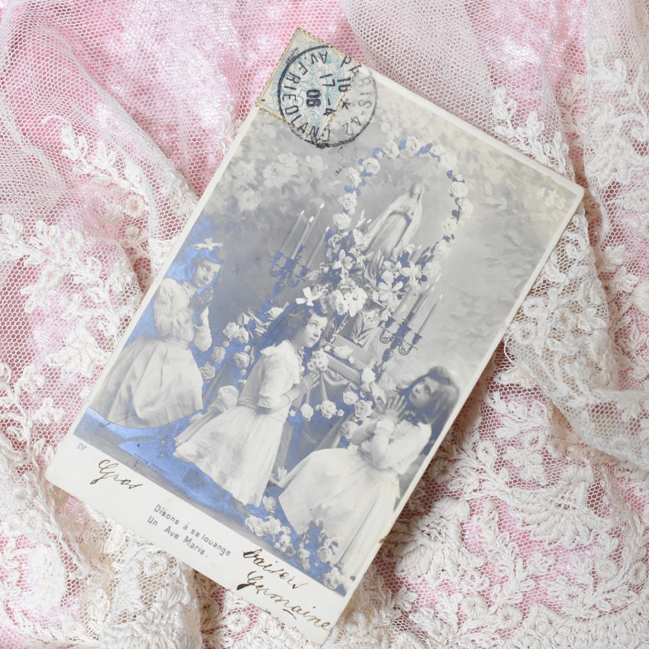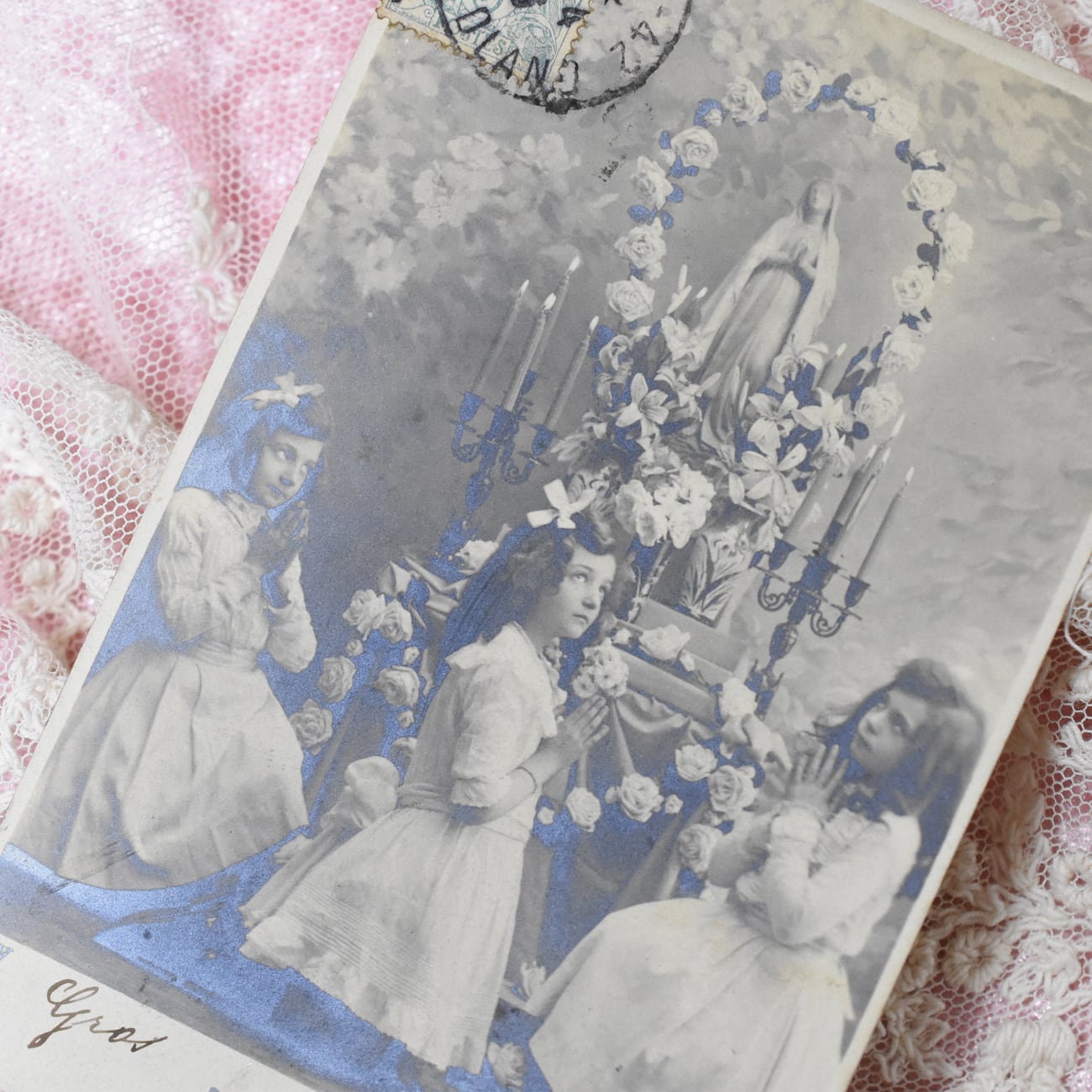 薔薇で飾られた祭壇のマリア様にお祈りする三姉妹の少女たちのアンティークポストカード。