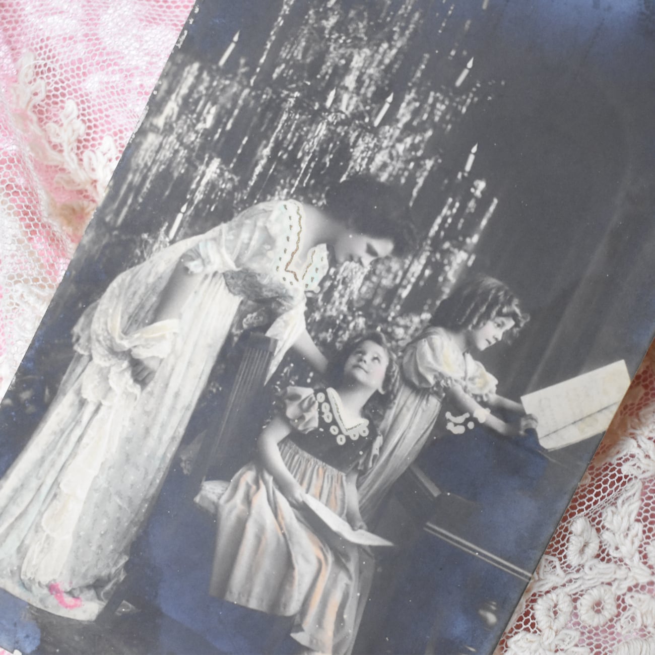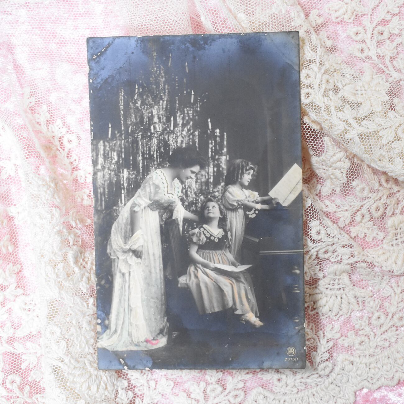 *Antique postcard クリスマスにピアノを奏でる美しい姉妹とママ Grete Reinwald Germany P247