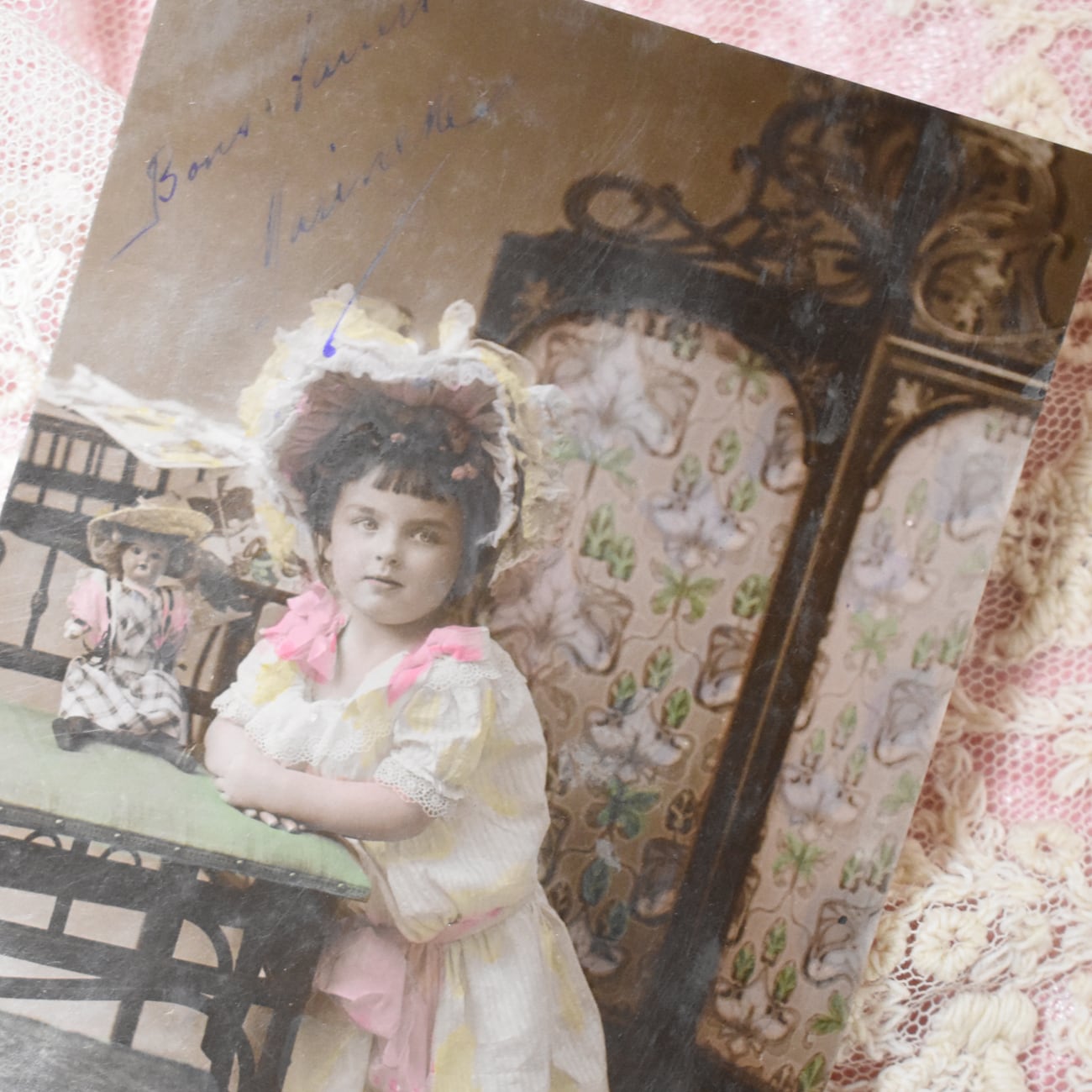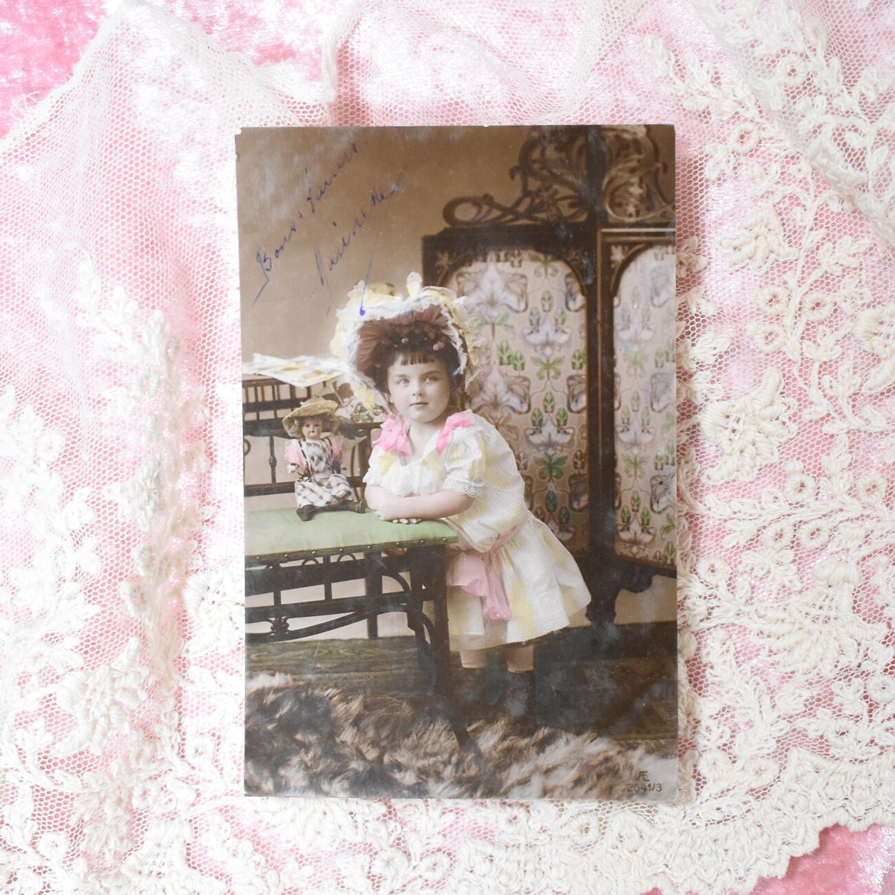 素敵なお部屋でくつろぐ可愛い少女とお人形のアンティークポストカード。