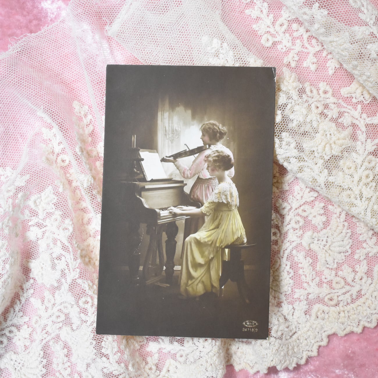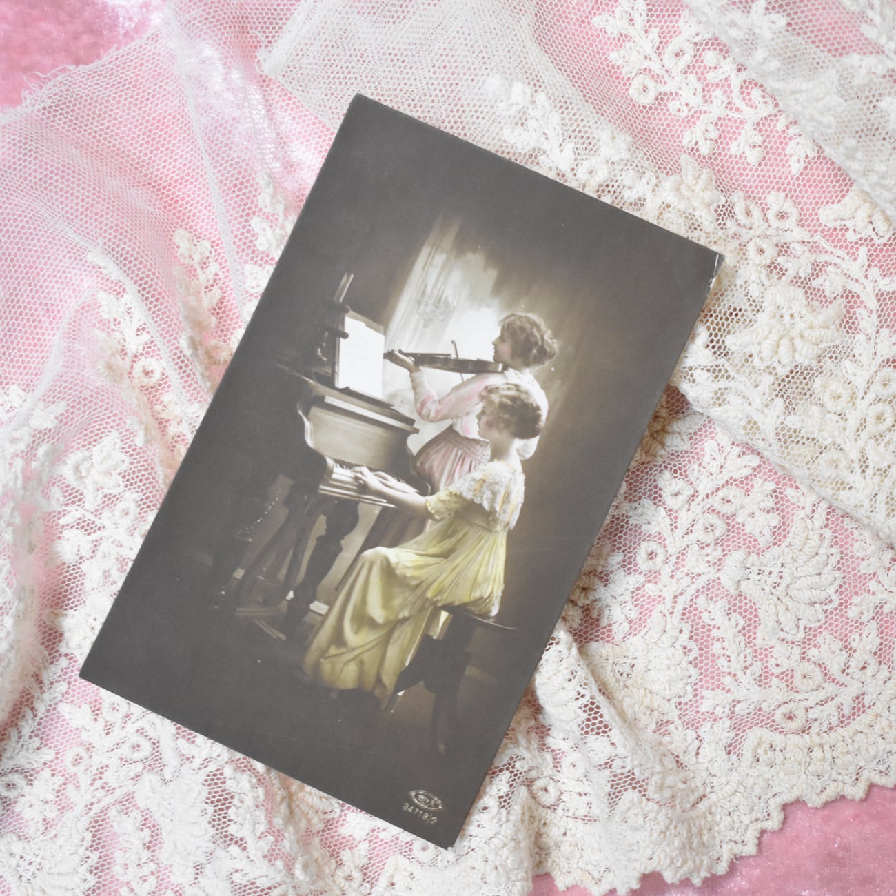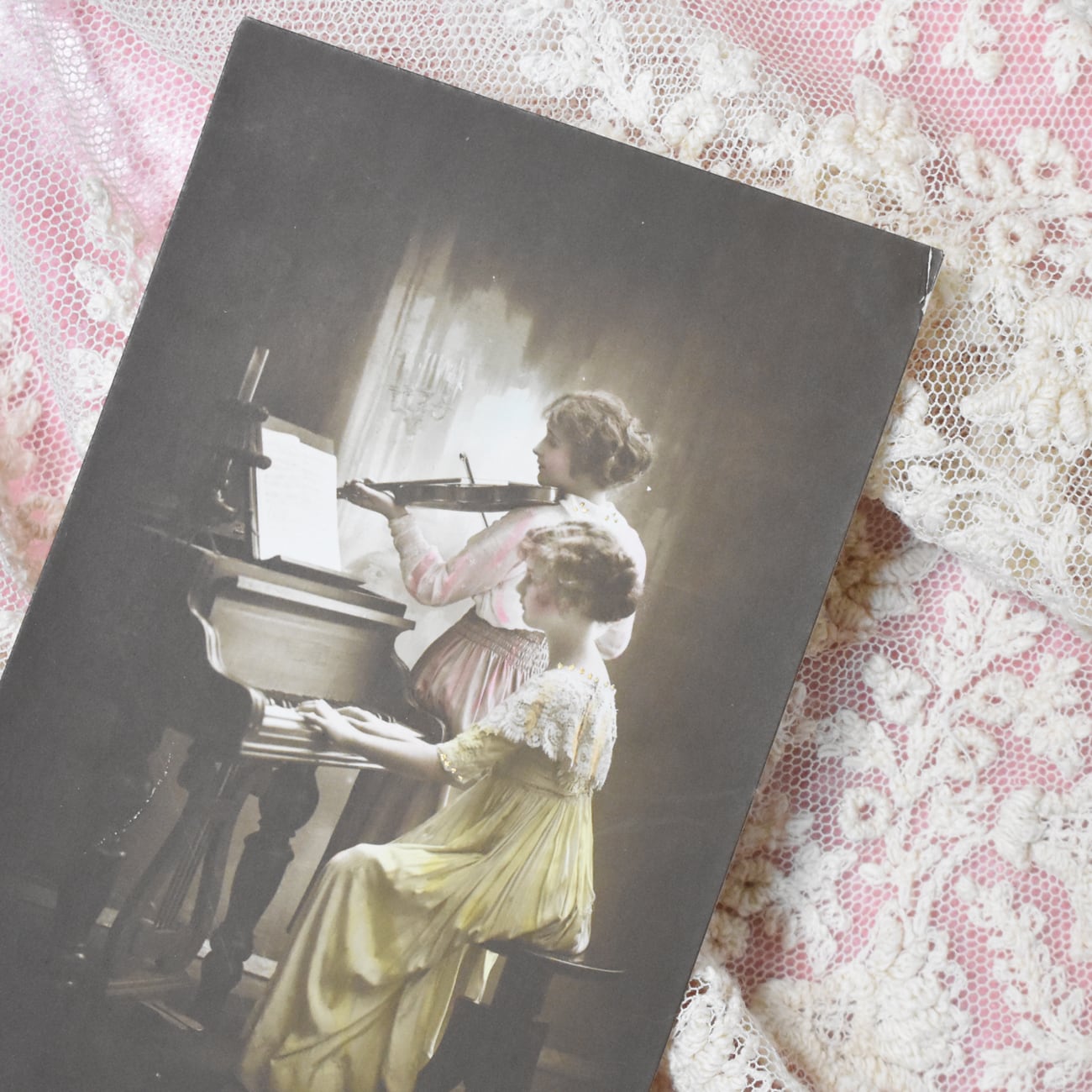 二人の姉妹が二重奏を奏でる美しい場面のアンティークポストカード。