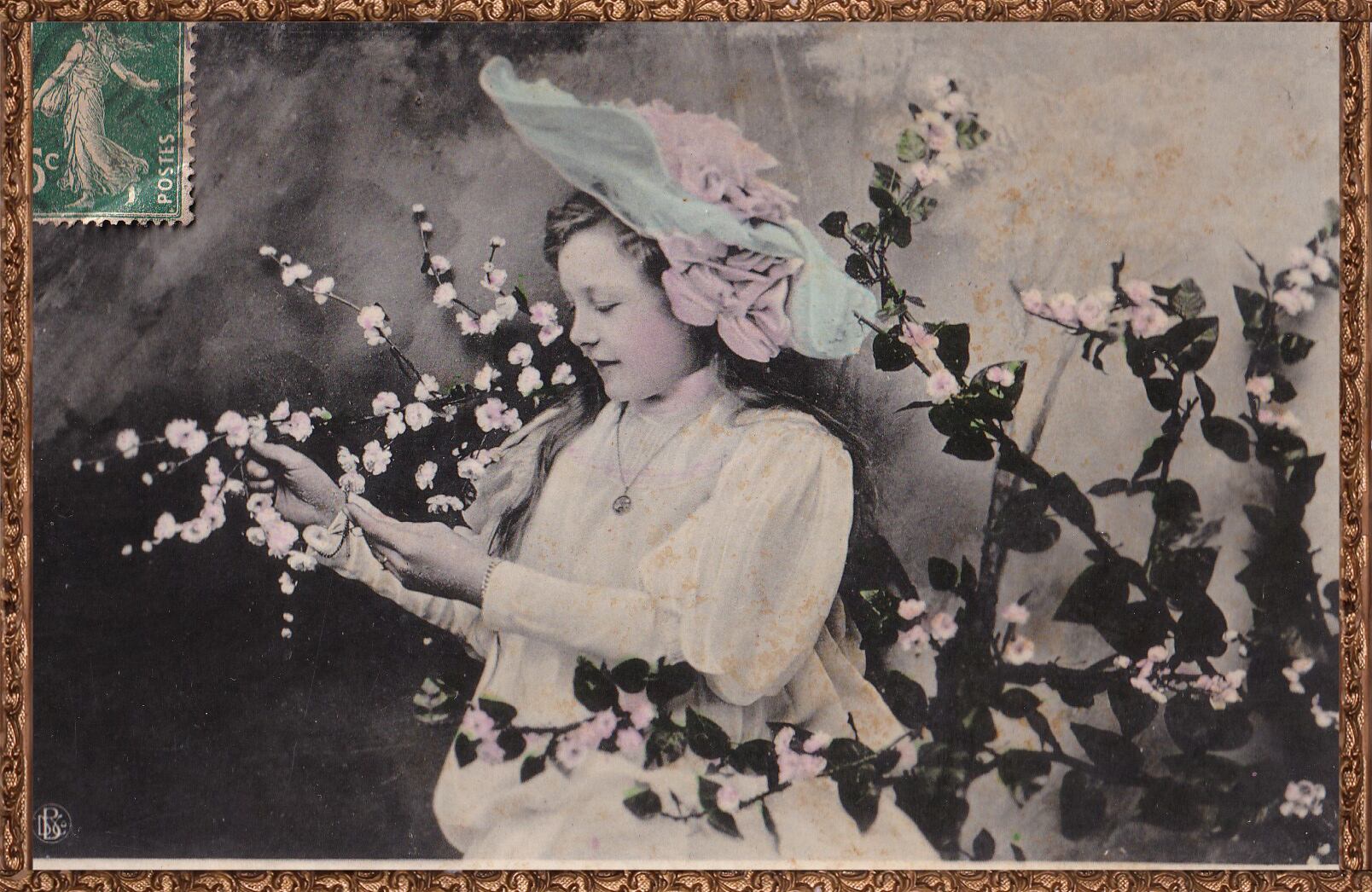 *Antique postcard お花にささやく可愛い少女 France P270
