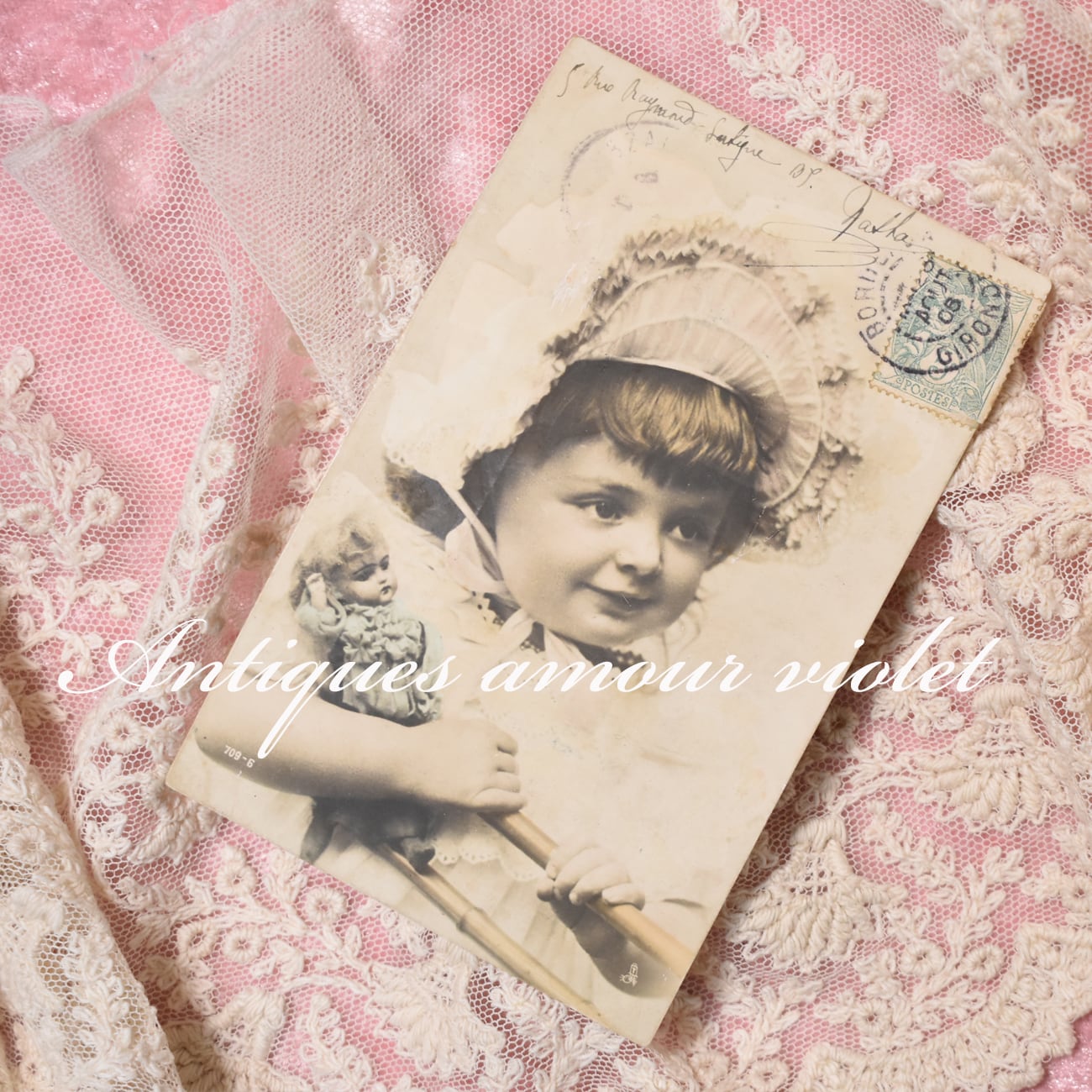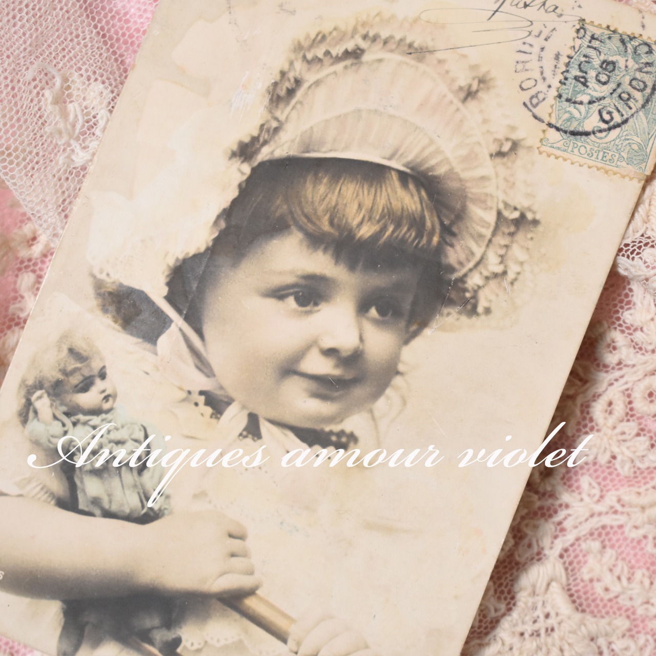 小さなお人形を大事に抱える可愛い少女のアンティークポストカード。