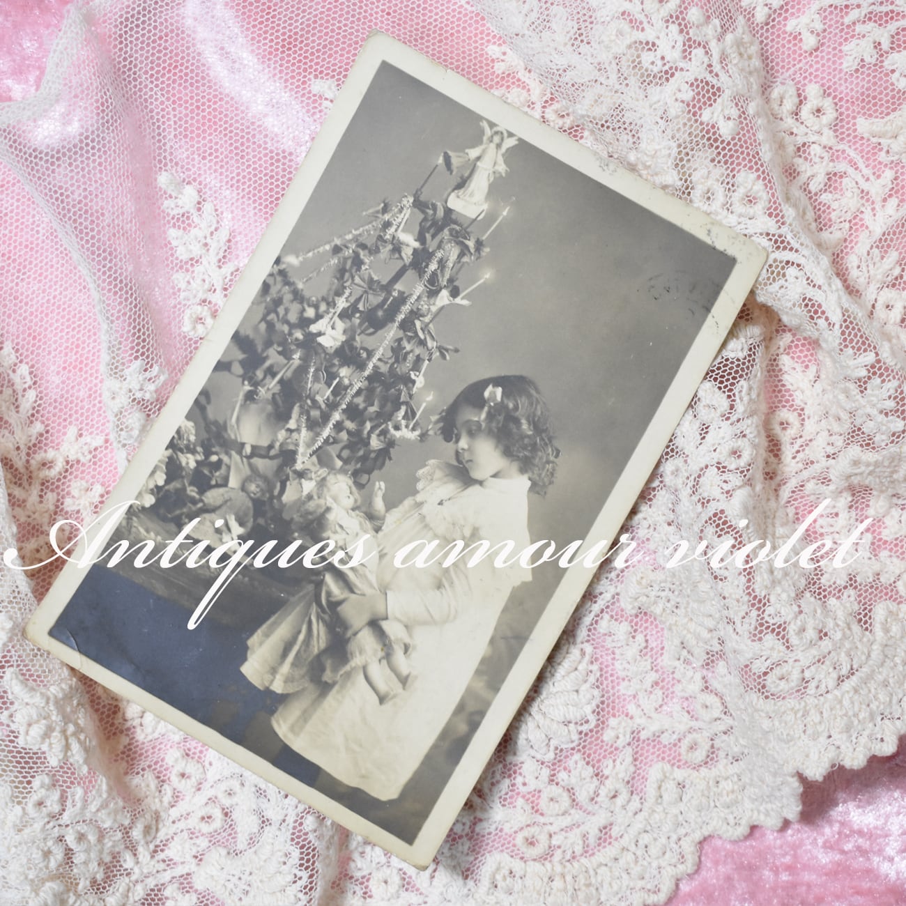 リボンとクロモスで彩られた愛らしいクリスマスツリーとサイドにリボンを結んだヘアスタイルがおなじみの少女モデルさんのアンティークポストカード。