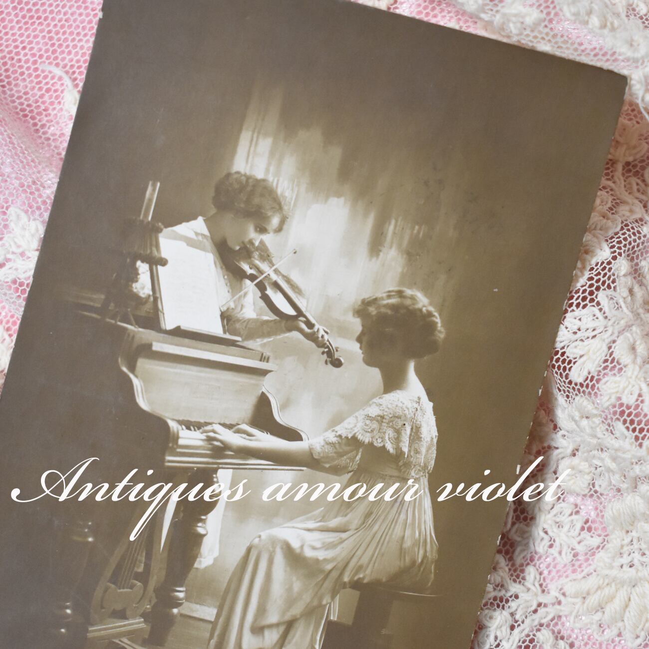 二人の姉妹が二重奏を奏でる美しい場面のアンティークポストカード。