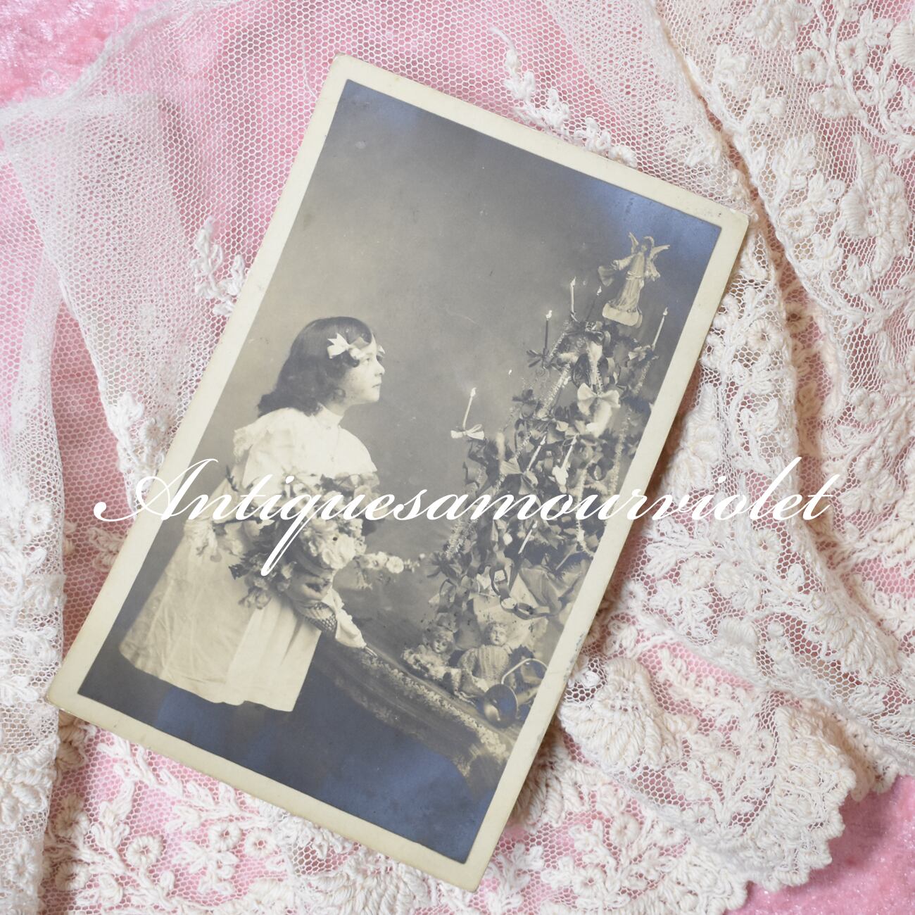 リボンとクロモスで彩られた愛らしいクリスマスツリーとサイドにリボンを結んだヘアスタイルがおなじみの少女モデルさんのアンティークポストカード。