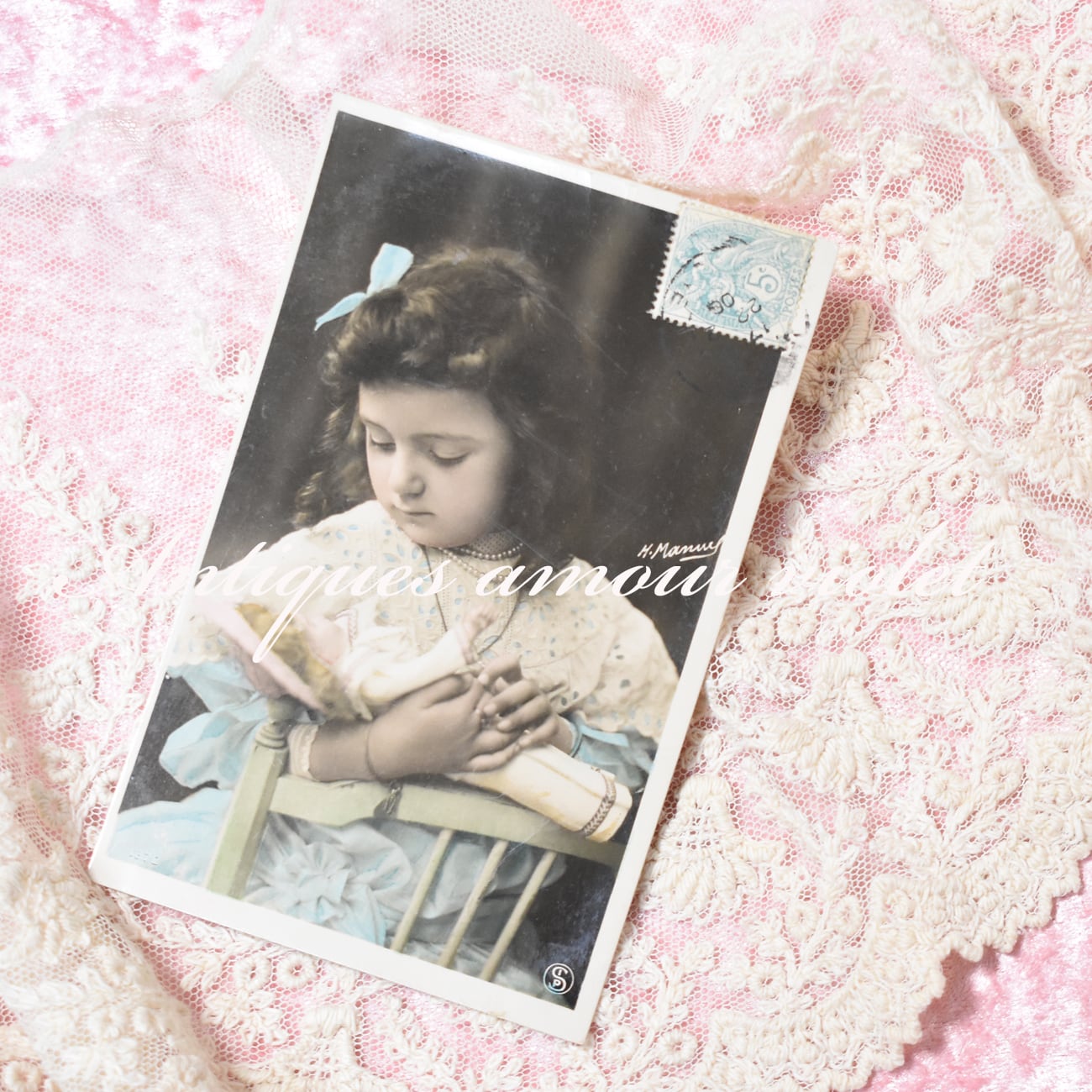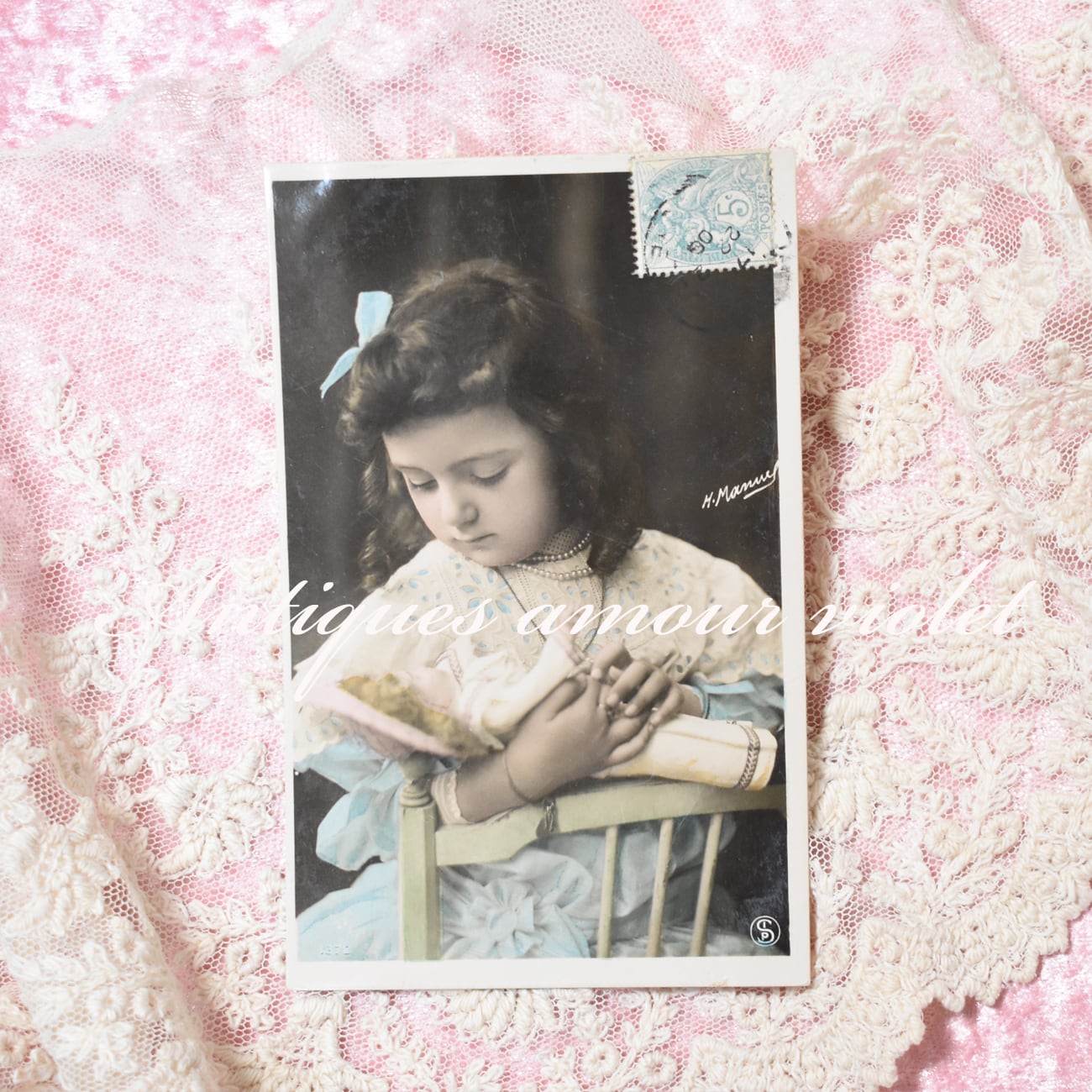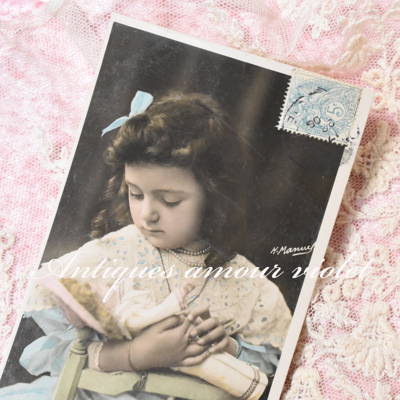 *Antique postcard お人形を寝かしつける可愛い少女 1906年 H.Manuel P290