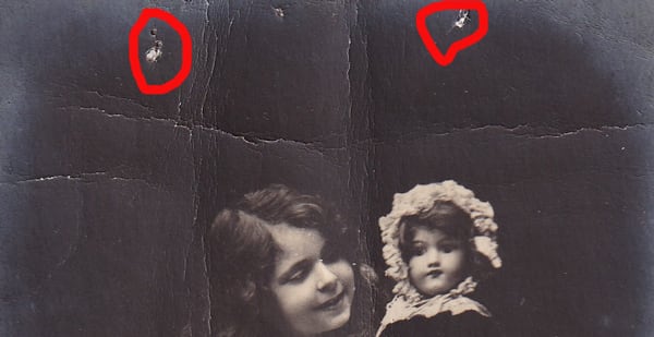 モノクロームの中に浮かび上がる少女とお人形のアンティークポストカード。