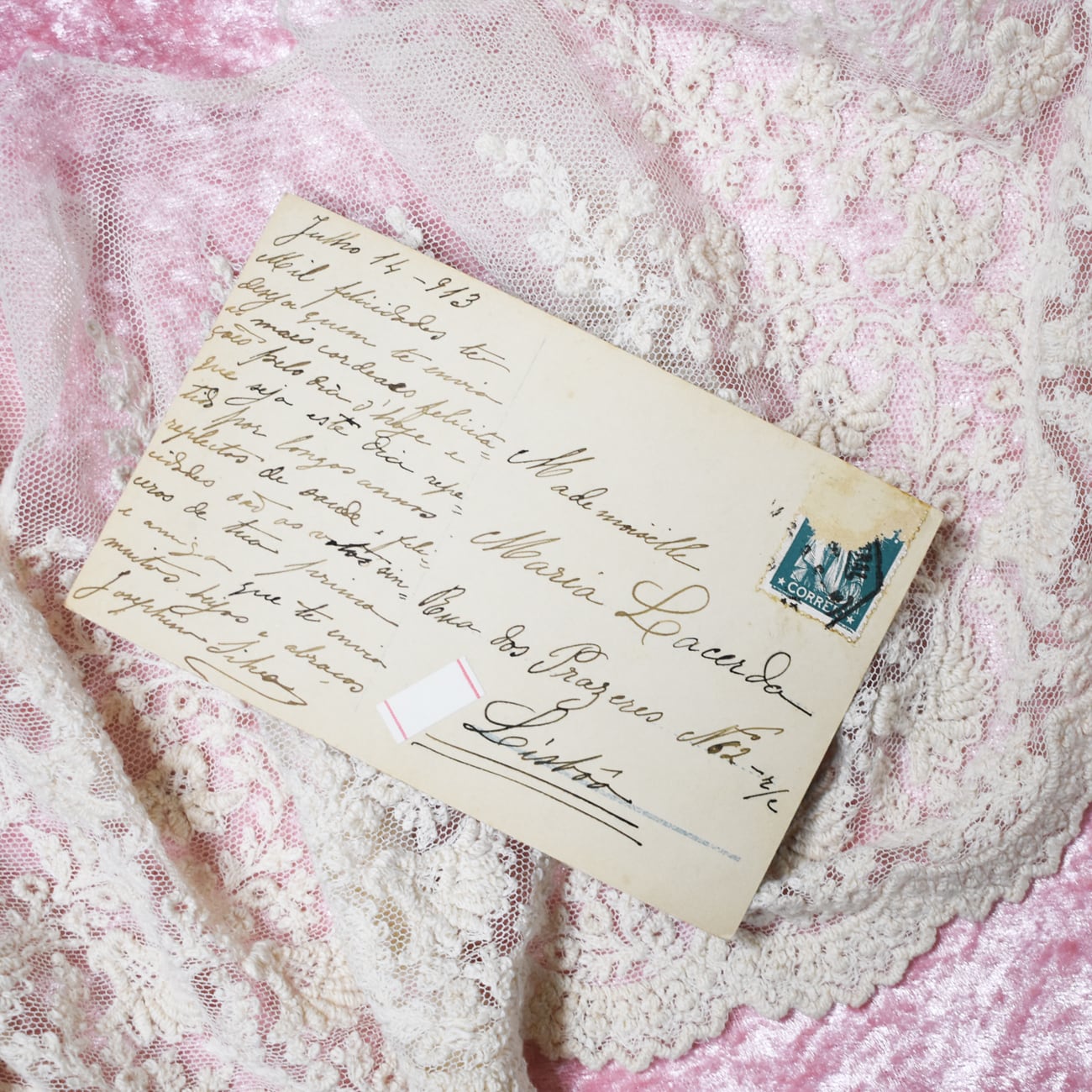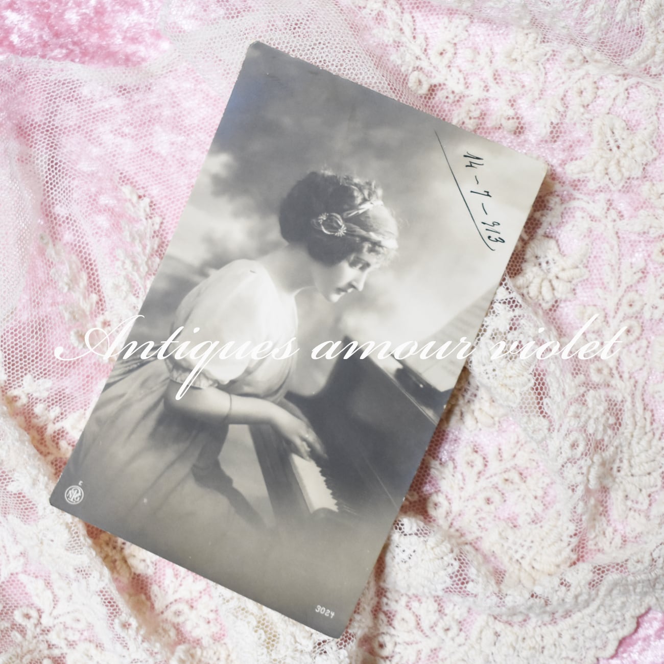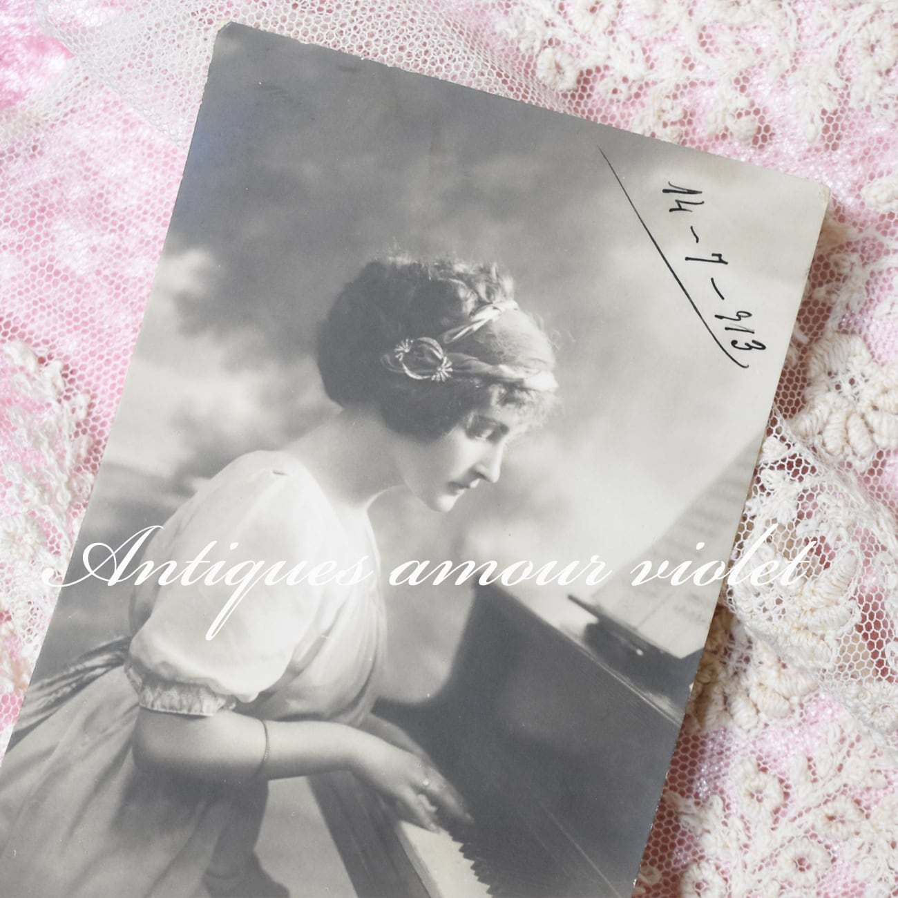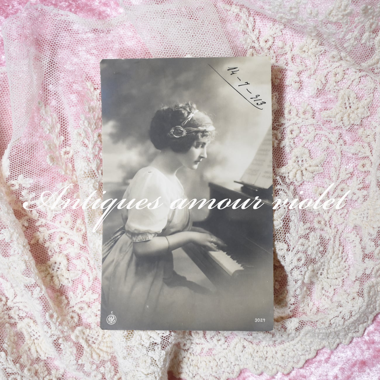 静寂のメロディーを奏でる美しいレディのアンティークポストカード。