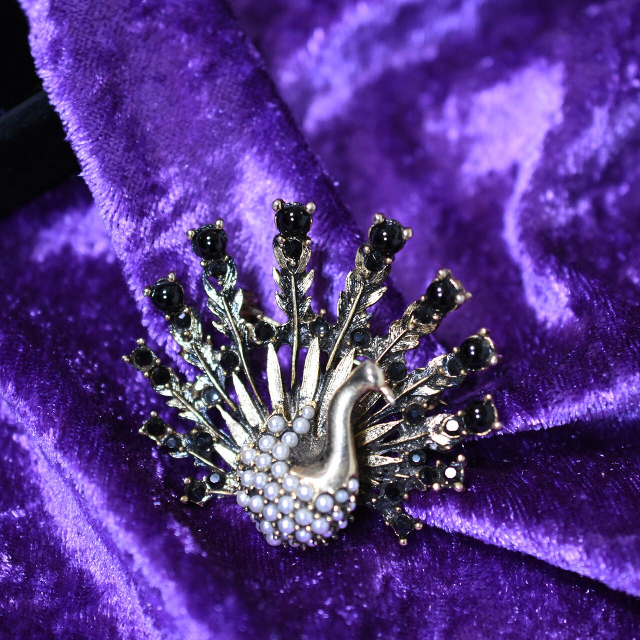 色鮮やかな孔雀をあえてブラック×ホワイトのモダンな印象に落とし込んだ色使いがスタイリッシュなヴィンテージブローチ。