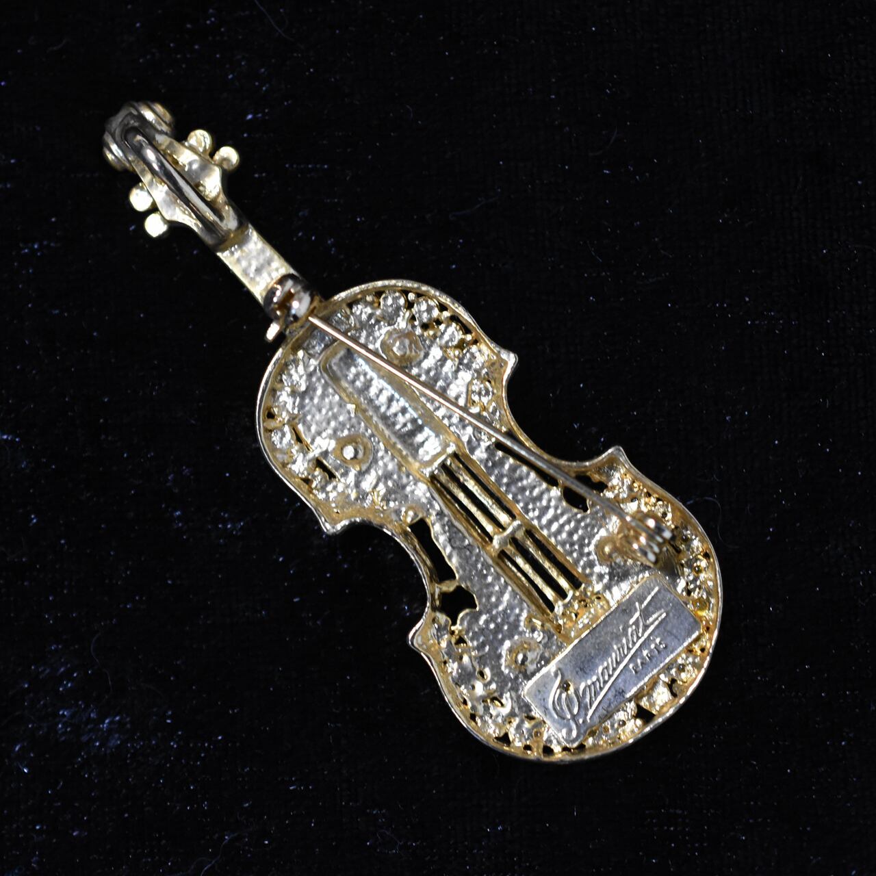 Vintage P.mauriat.PARIS goldmetal×rhinestone violin motif brooch Made in France B004