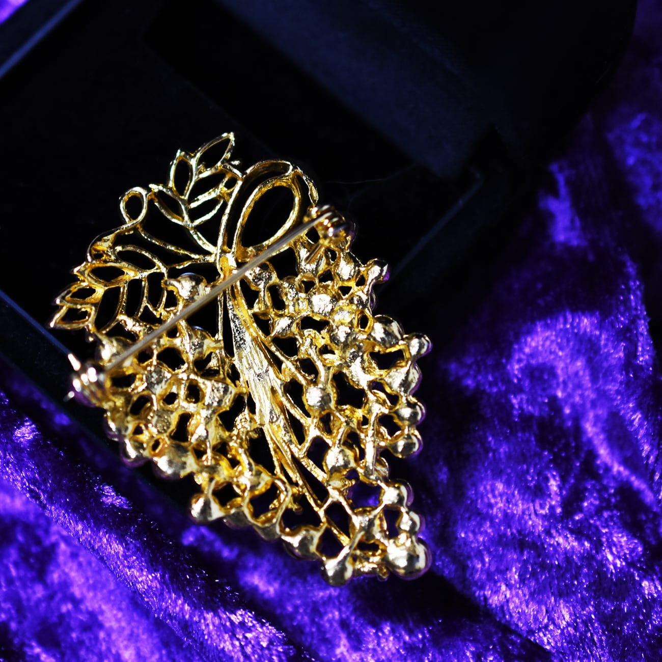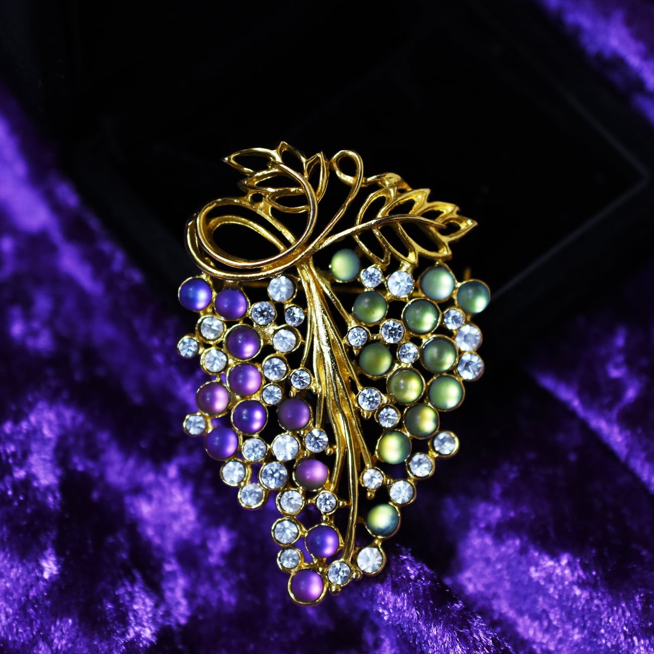 角度によって若干色味を変化させるユニークなフロストガラスとクリアラインストーンの輝きが美しいオータムシーズンにぴったりな葡萄モチーフのヴィンテージブローチ。