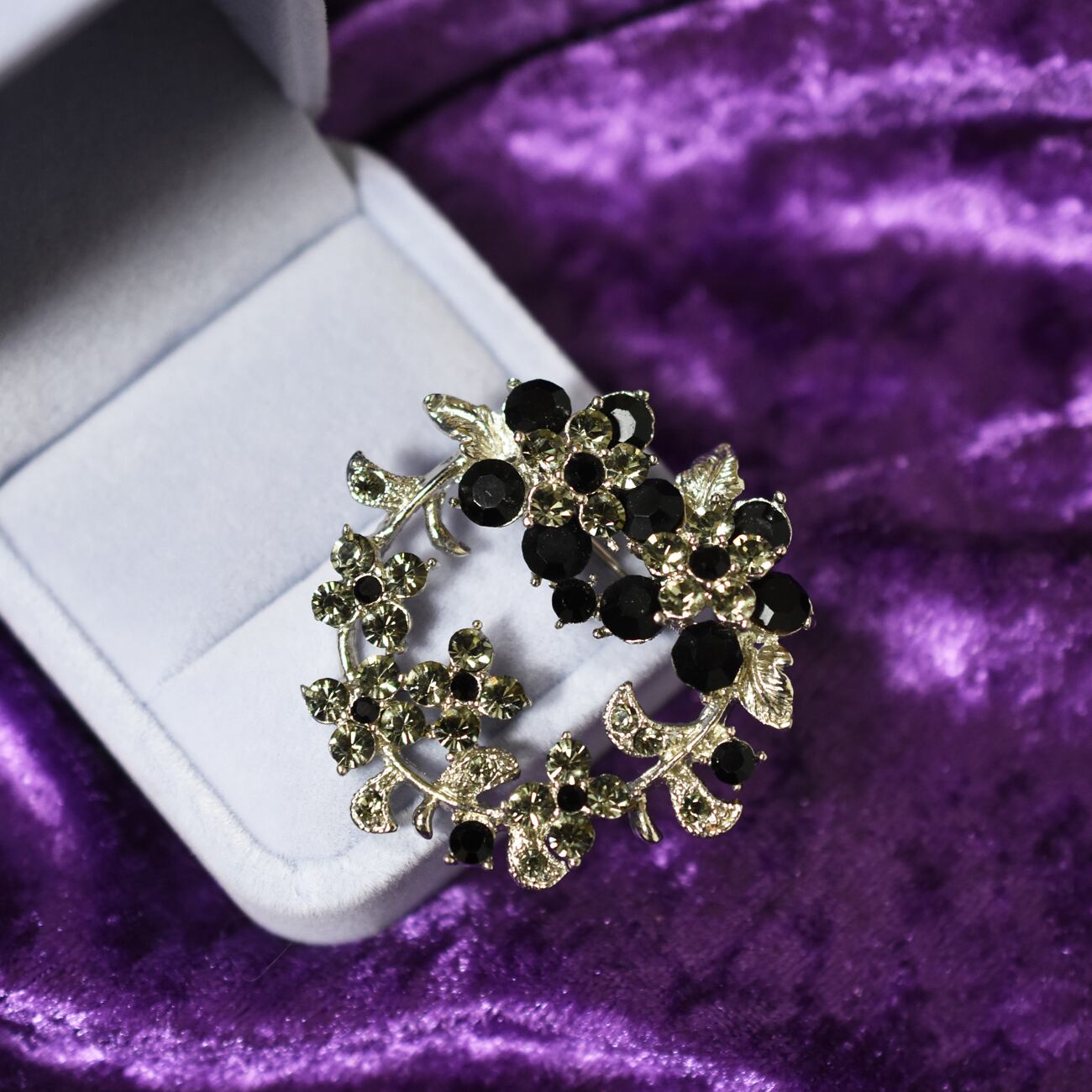 ブラック×クリアブラック ラインストーン ビジュー フラワー&リーフ モチーフ シルバーメタル リース ヴィンテージブローチ。