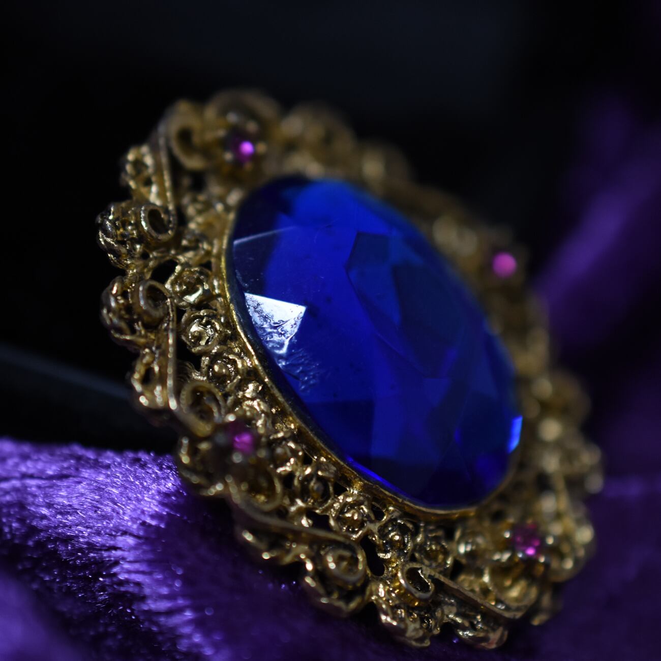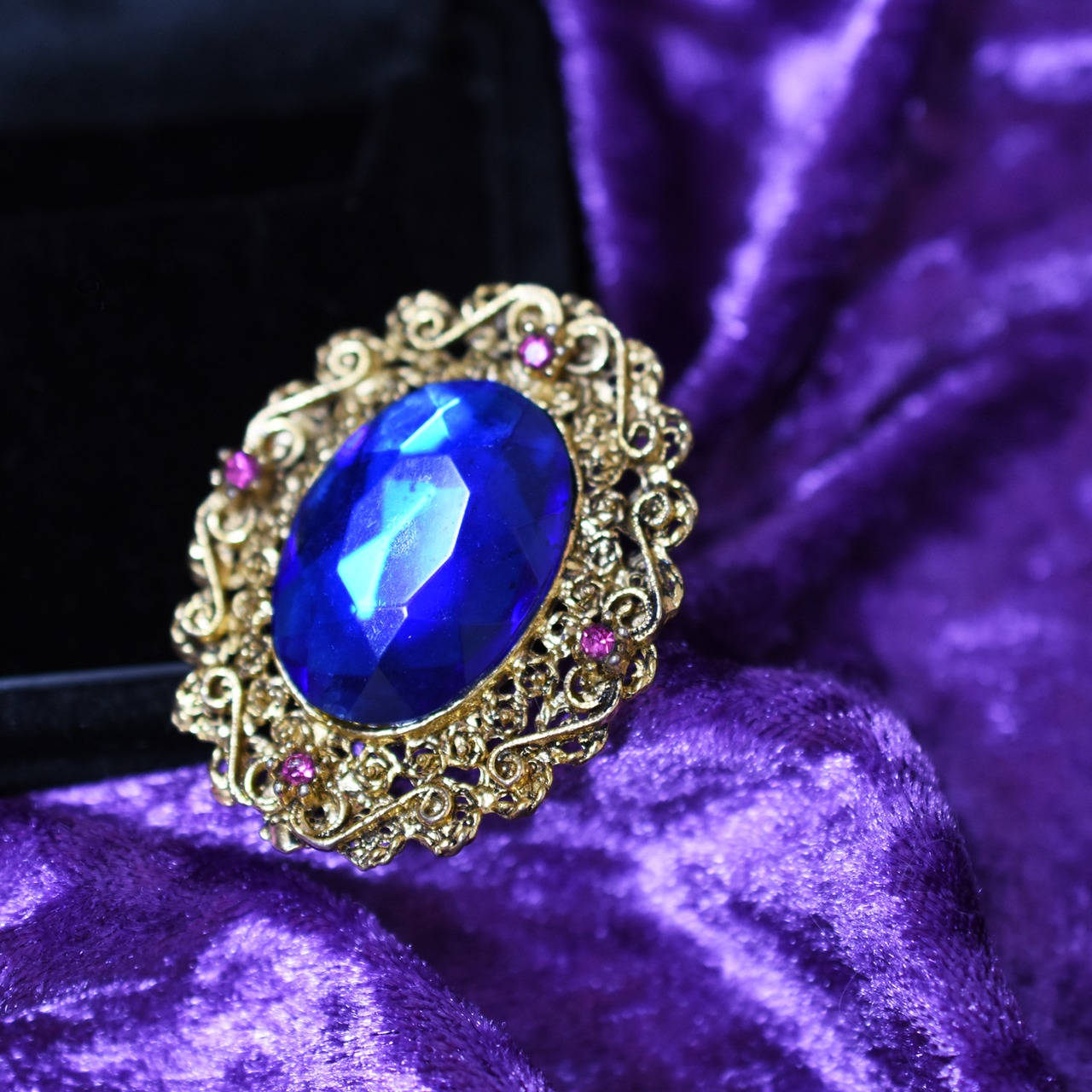 美しく繊細なフィリグリー細工に大ぶりの鮮やかなブルーが映えるビジューとビビッドピンクのラインストーンがポイントとしてあしらわれた華やかなヴィンテージブローチ。