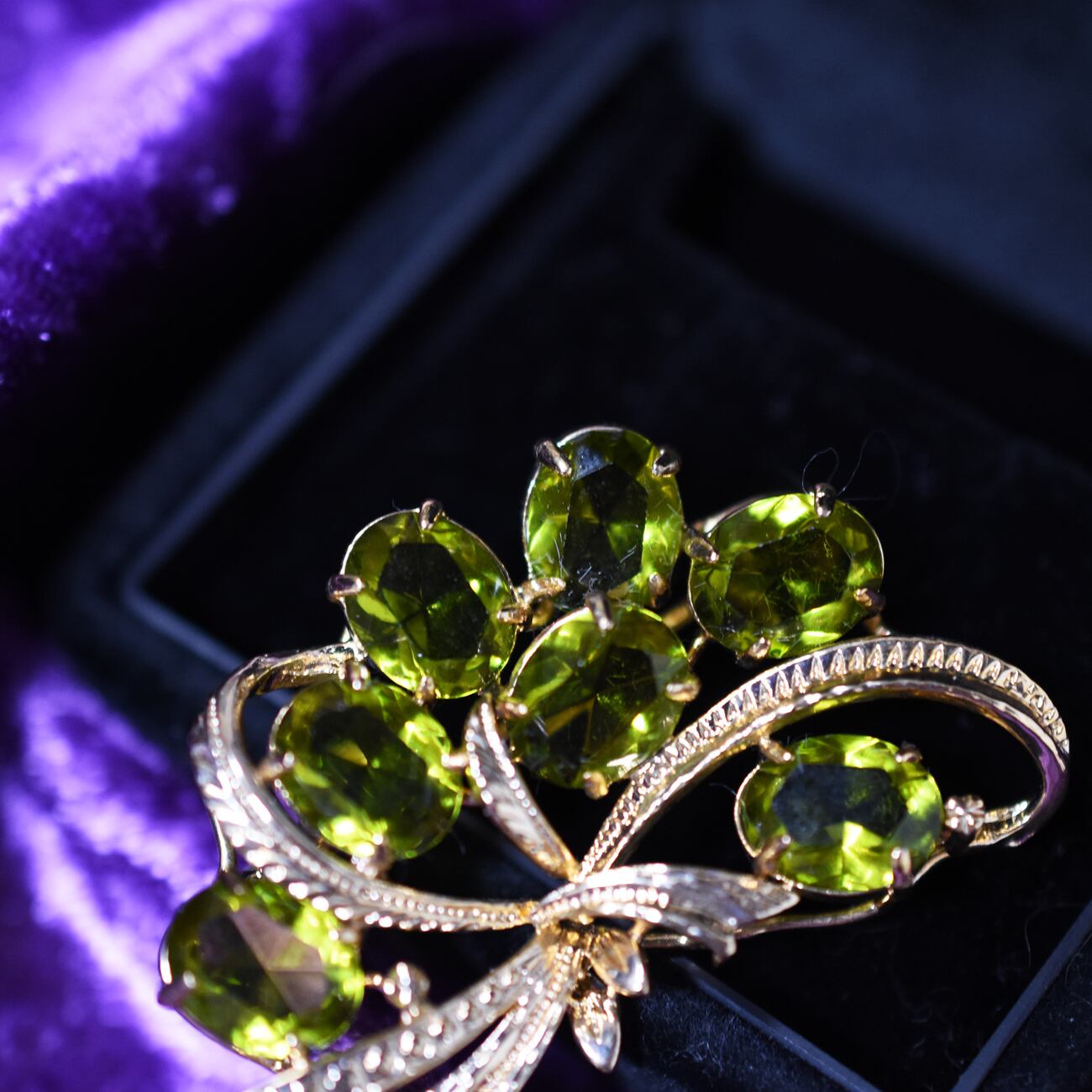 マスカットグリーンという表現が正に当てはまる透明感溢れる瑞々しいストーンが7個セットされた美しいヴィンテージブローチ。
