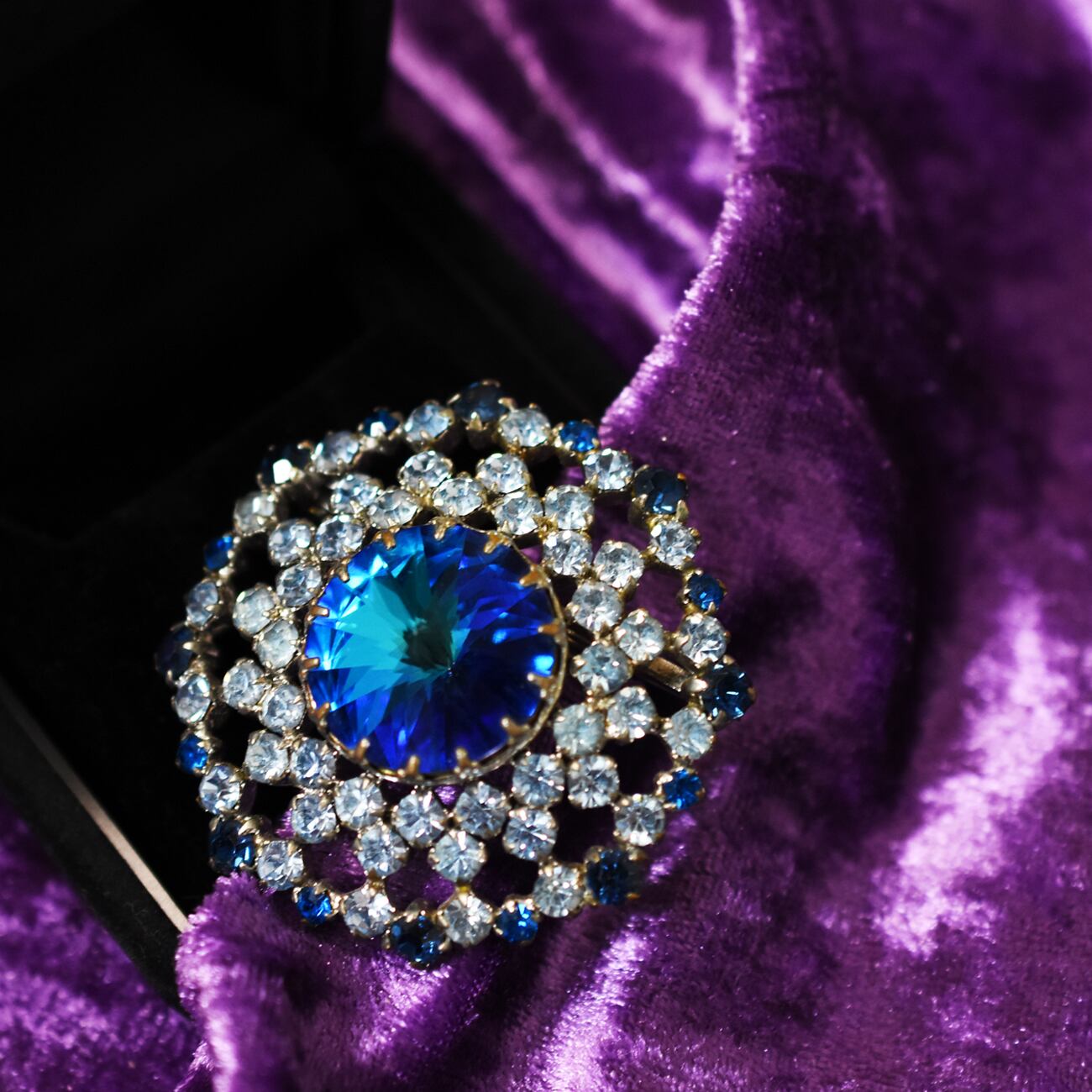 ヴィンテージ ブルー ビジュー ラインストーン サークル シルバーメタル ブローチ。