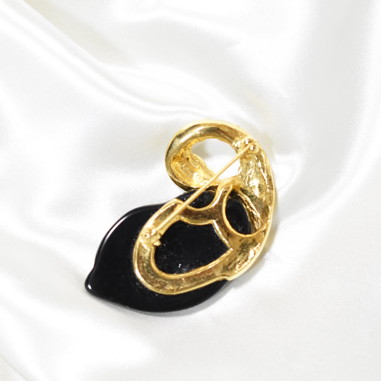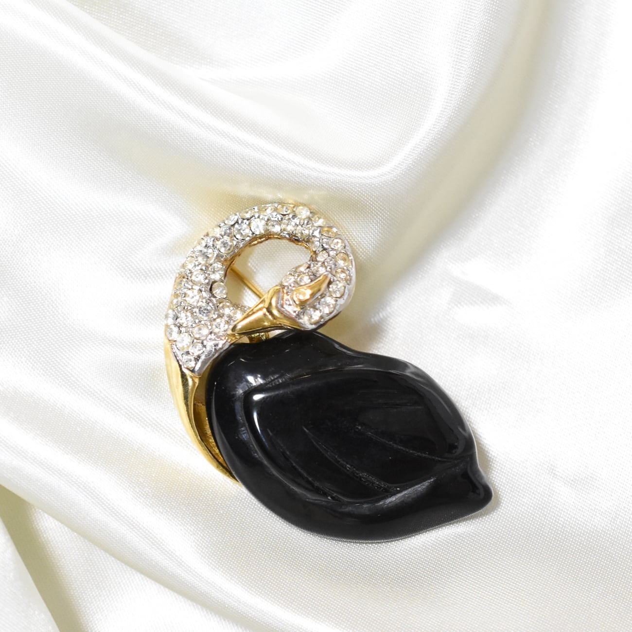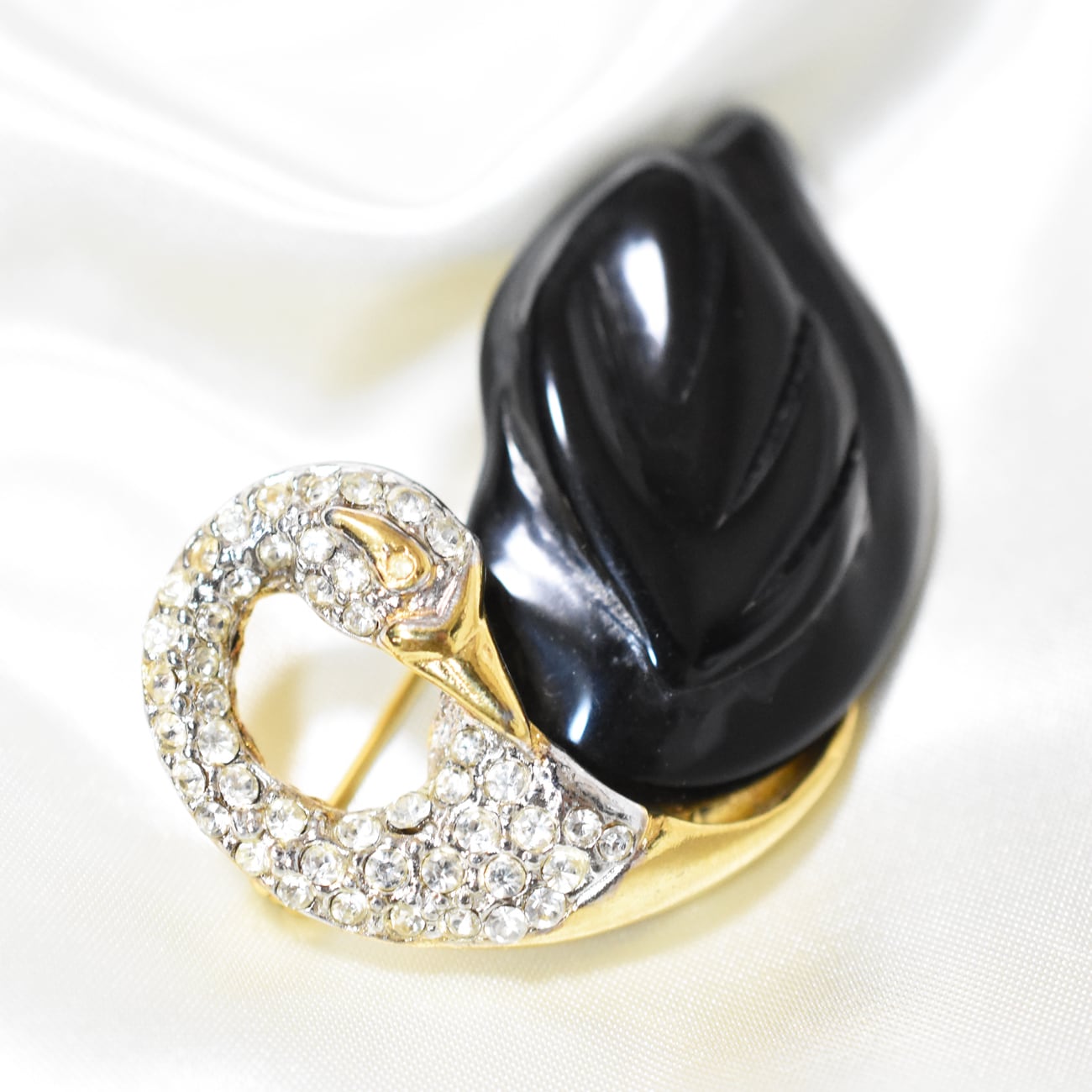ヴィンテージ スワンモチーフ クリアラインストーン×ブラックプラスティック ゴールドメタル ブローチ