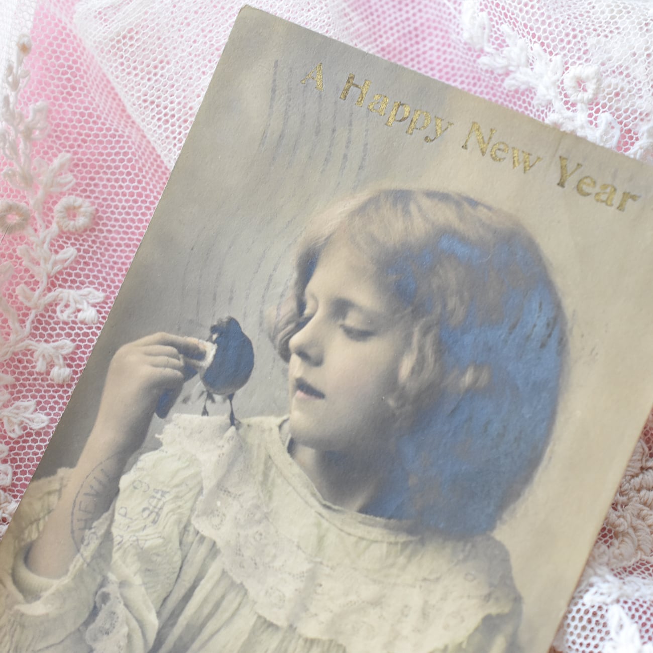 お勉強中に肩にとまった小鳥にごはんをあげる少女のアンティークポストカードです。