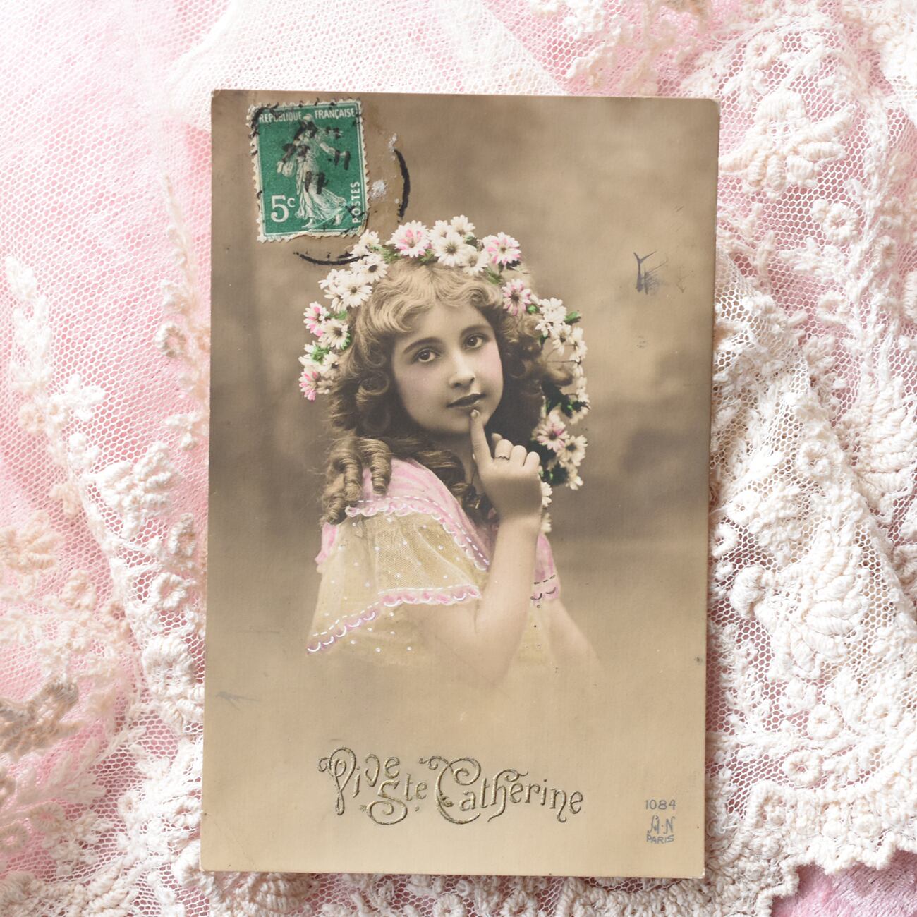 こちらのポストカードの少女モデルは1900年代初頭頃の幼少期から10代半ばまで活躍したフランスのフォトポストカードにおいて多数のモデル作品を残したリボンをつけた縦ロールの愛らしい少女モデル。