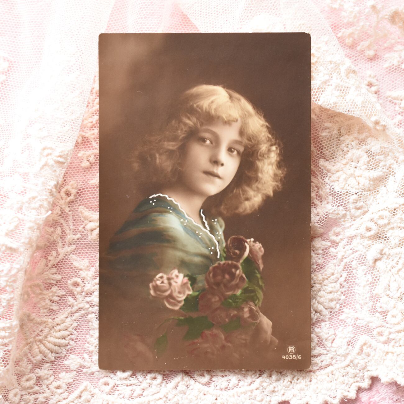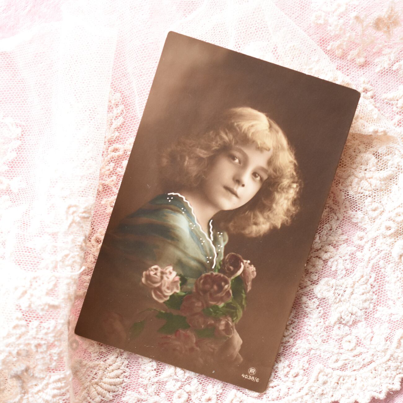薔薇の花を抱える美しい少女・グレーテ・ラインヴァルドのアンティークポストカード。